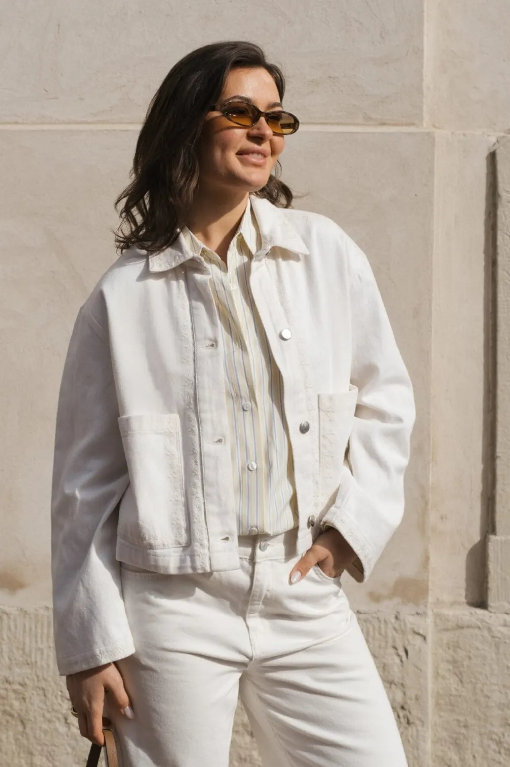 Hvid denimjakke fra Neo Noir med kort, boxy pasform. Jakken har broderede kanter og praktiske lommer foran. Knaplukningen og skjortekraven giver jakken et klassisk udtryk.