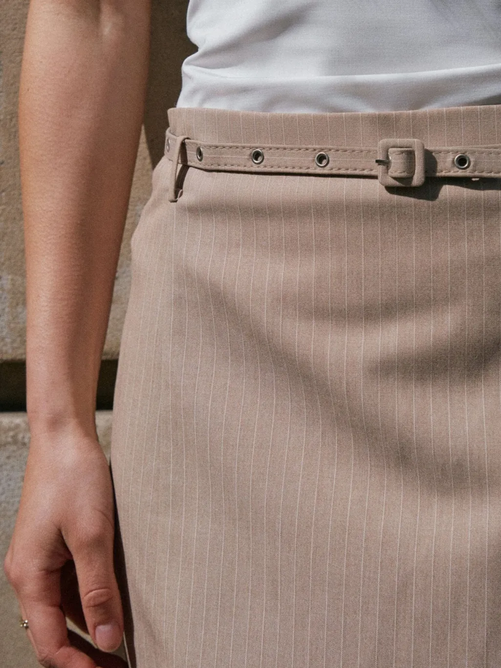 Sandfarvet mini-nederdel fra Neo Noir med nålestribet mønster. Designet med frontslids og bælte med spænde. Nederdelen har en lige skæring og sidder i taljen.