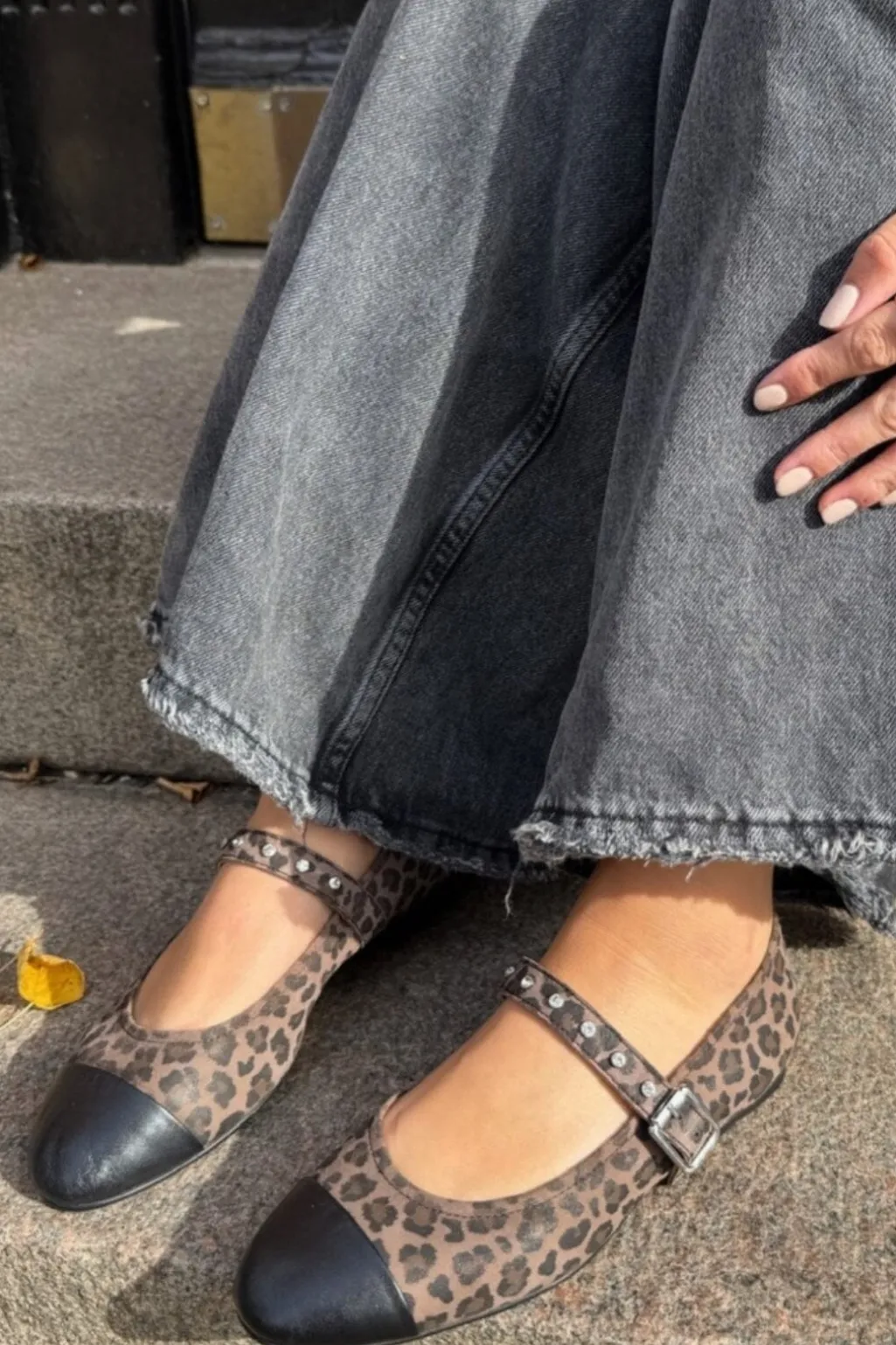 Ballerinaer i ruskind med leopardmønster og sort tåkappe. Remmen over vristen har nitter og spænde, der giver god støtte til foden.