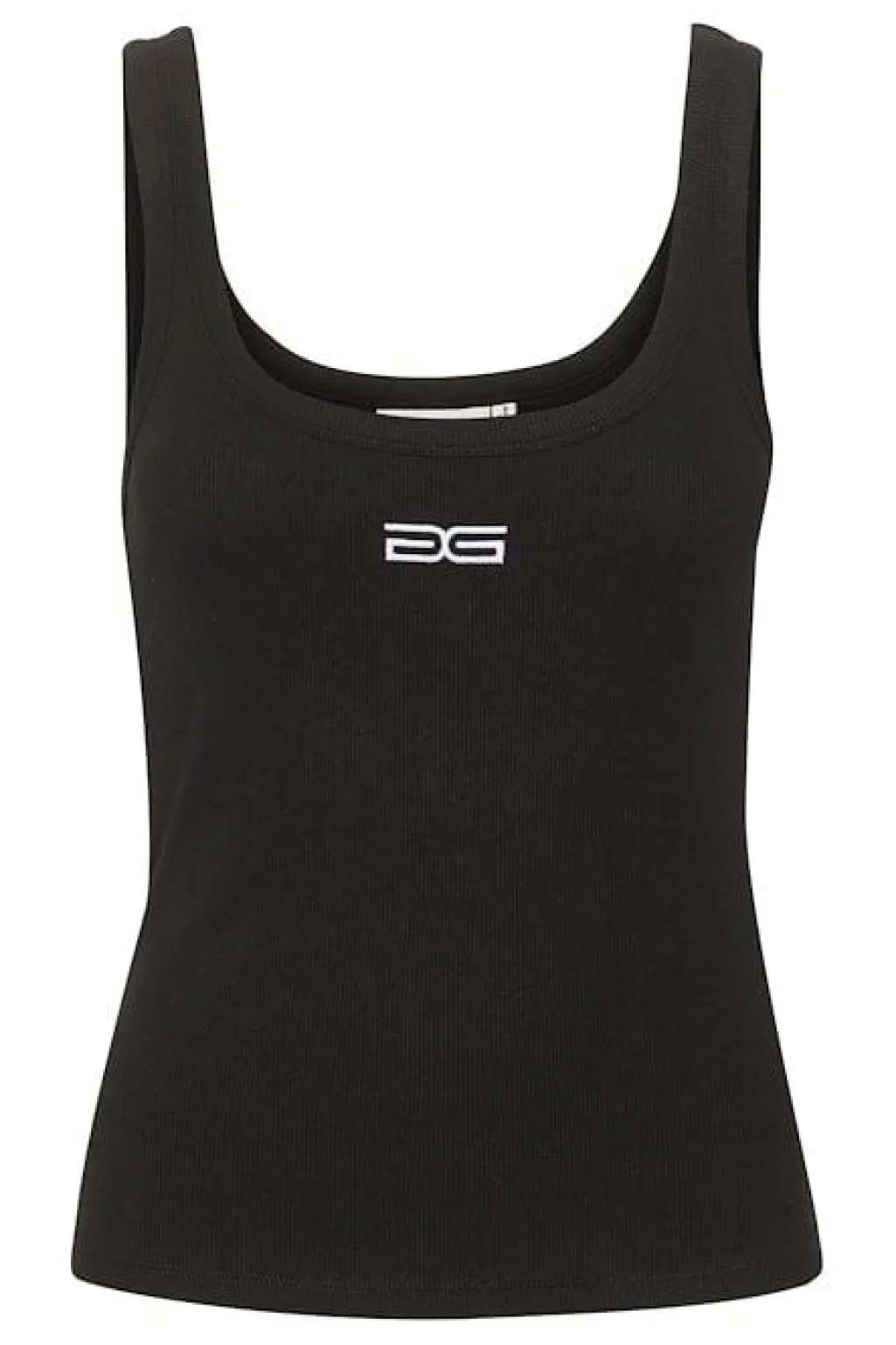 Sort tanktop fra Gestuz med ribbet tekstur og rund halsudskæring. Den tætsiddende top har et lille hvidt logo på brystet og brede stropper.
