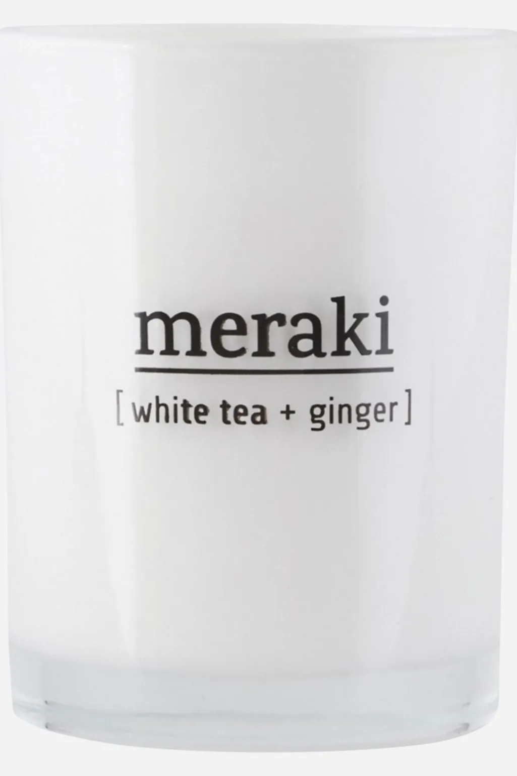 Duftlys i hvid glasbeholder med aroma af hvid te og ingefær. Lyset har en højde på 6,7 cm og en diameter på 5,5 cm.