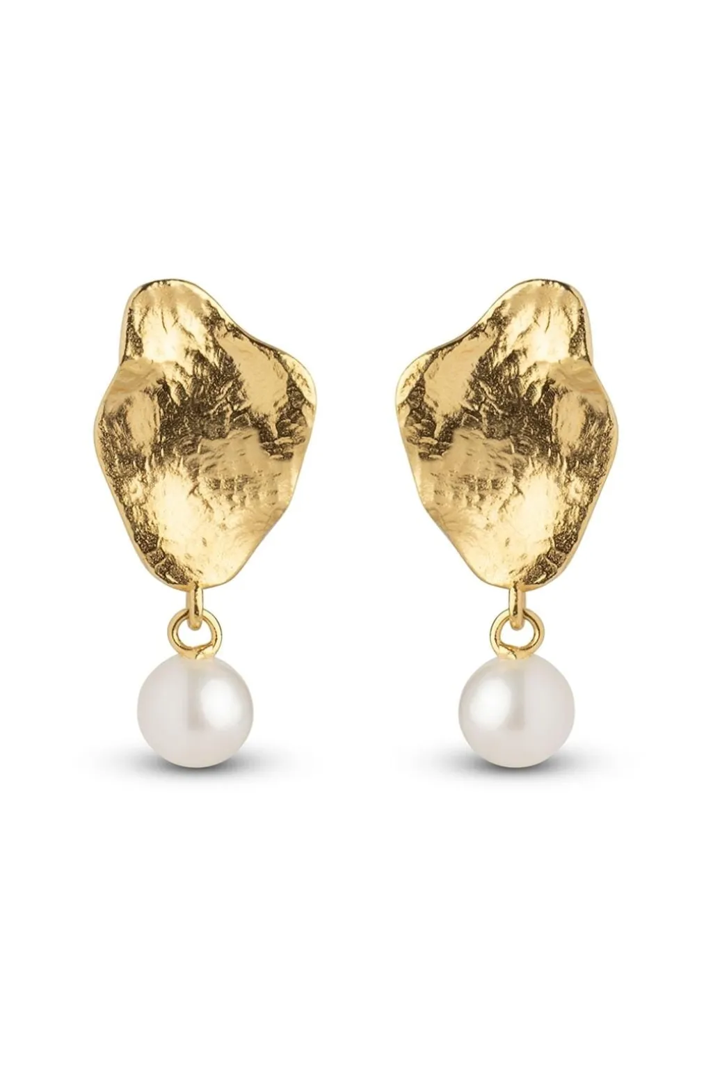 Øreringe fra Enamel Copenhagen med en bølget overflade i guldbelagt sølv. En hvid ferskvandsperle hænger fra den organiske guldplade.