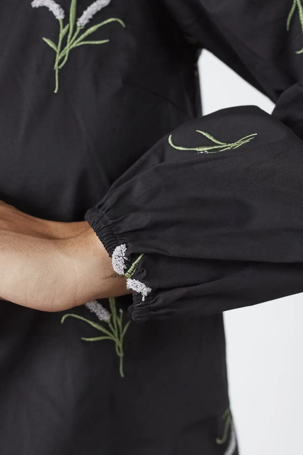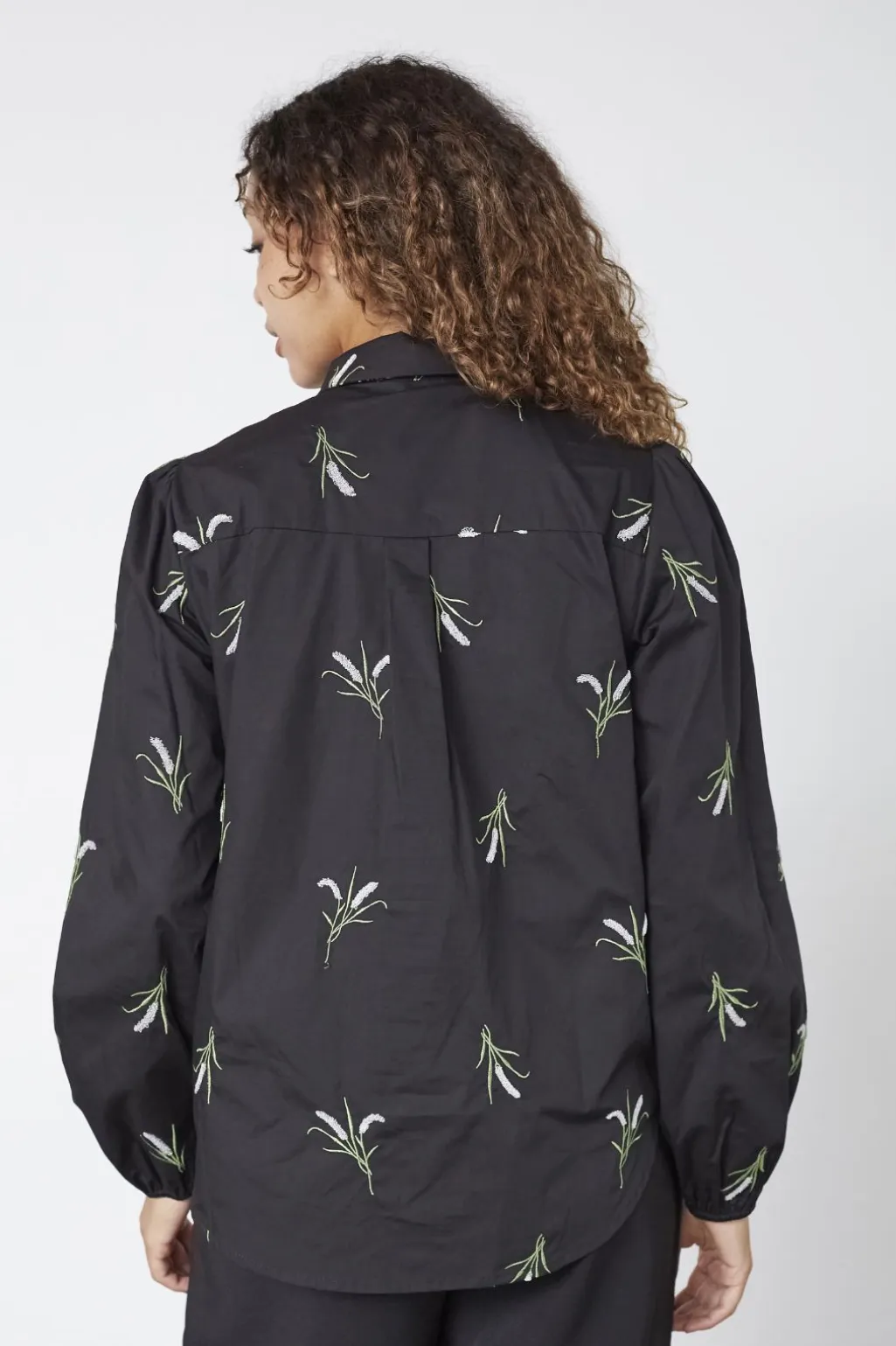 Bluse fra Sisters Point i sort bomuld med broderet blomstermønster. Blusen har en klassisk krave og lange ærmer med smock-design.