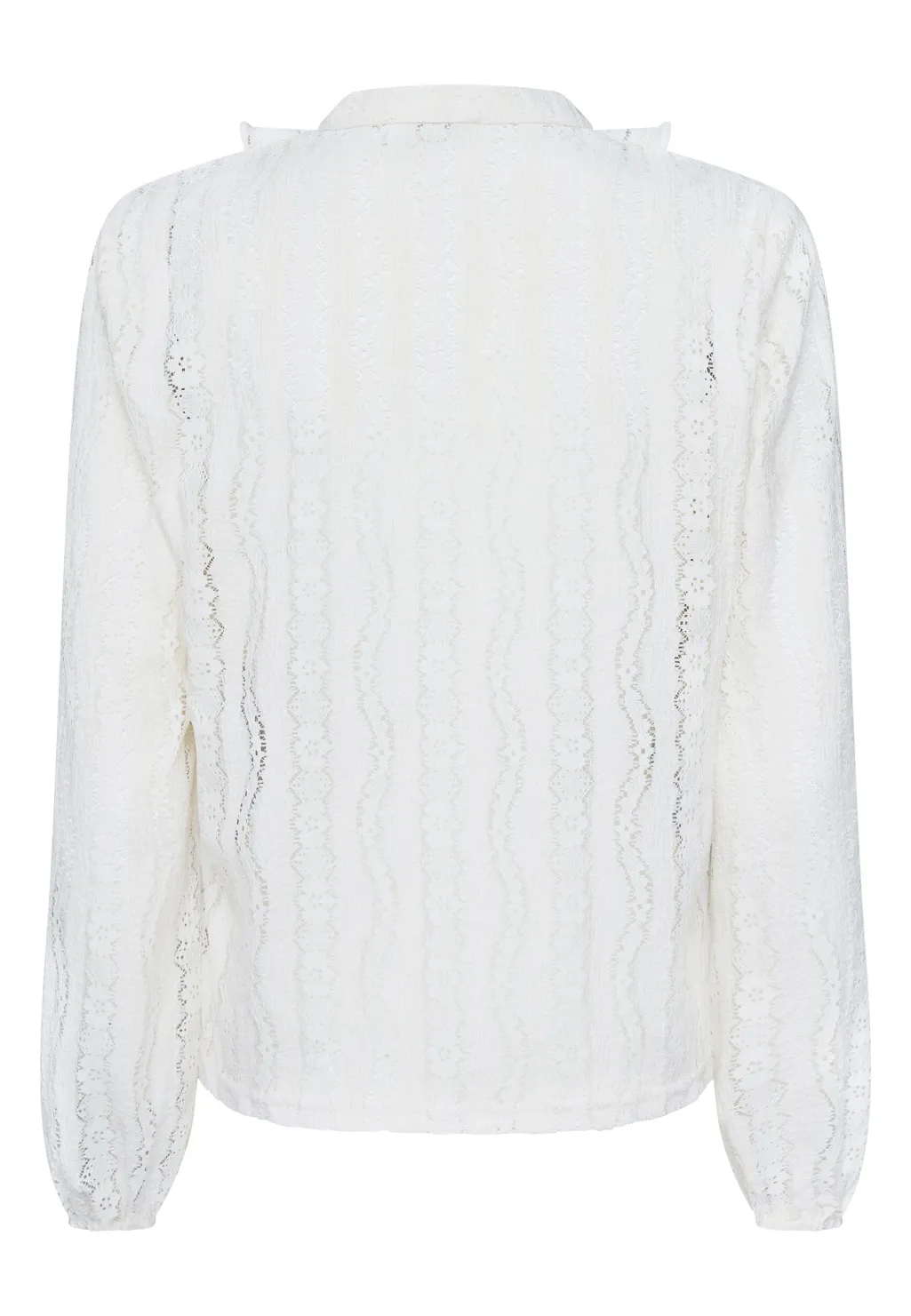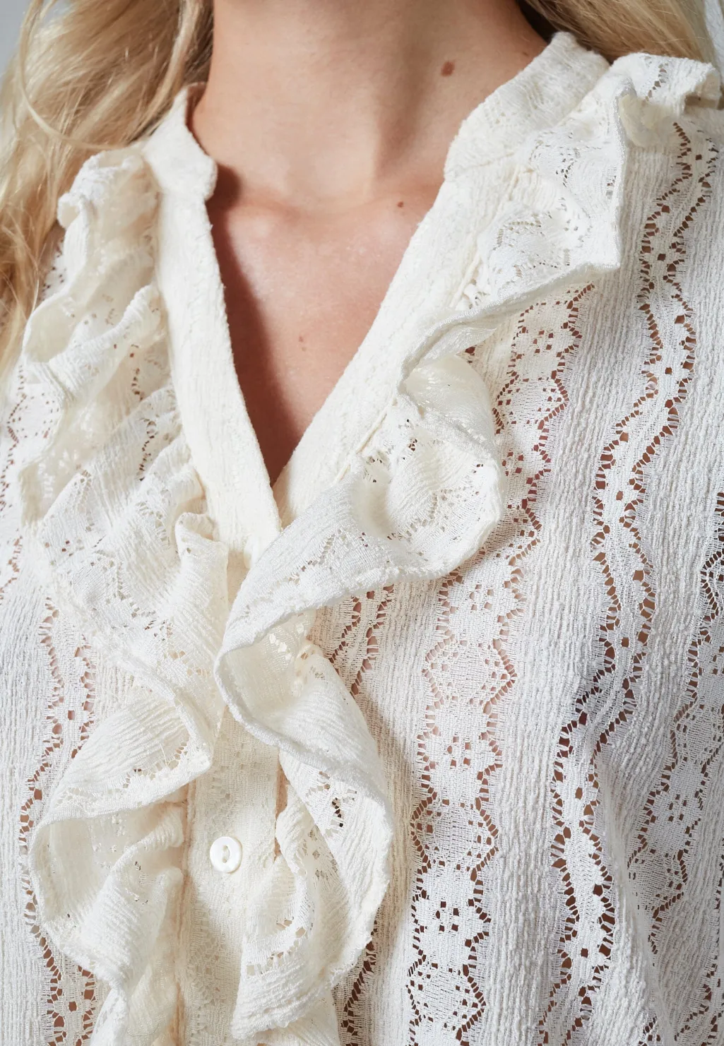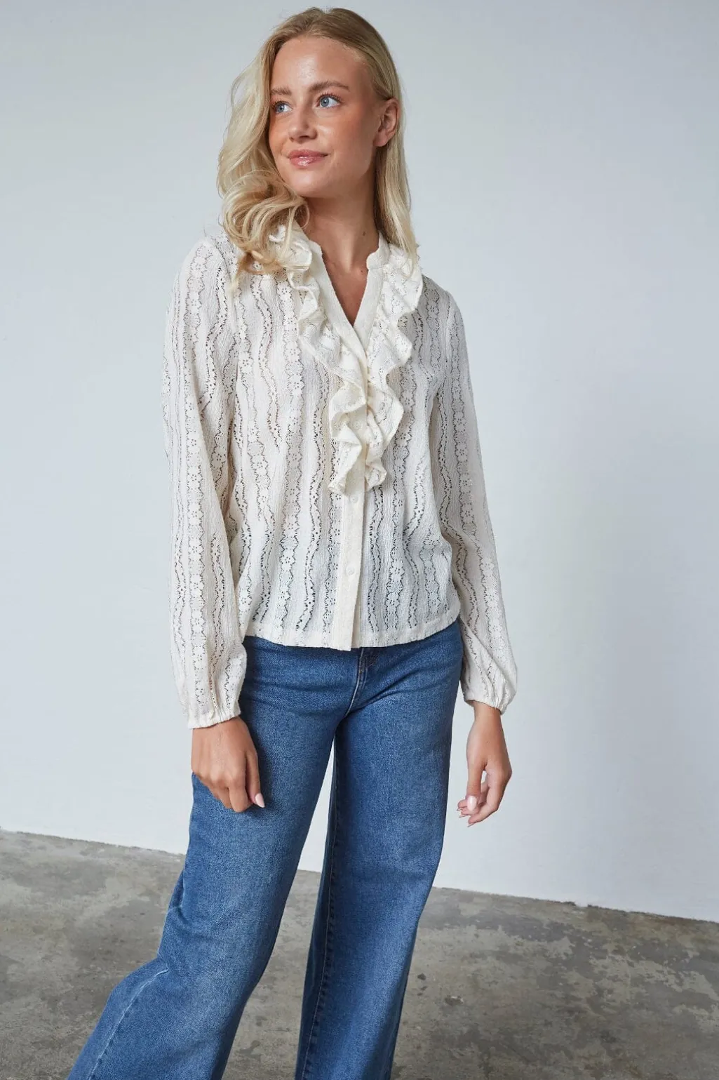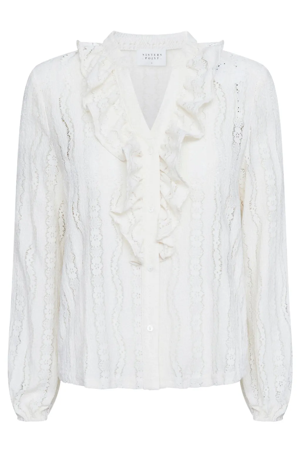 Cremefarvet bluse fra Sisters Point med et lodret blondemønster. Blusen har lange ærmer, V-udskæring med flæser og knaplukning foran.