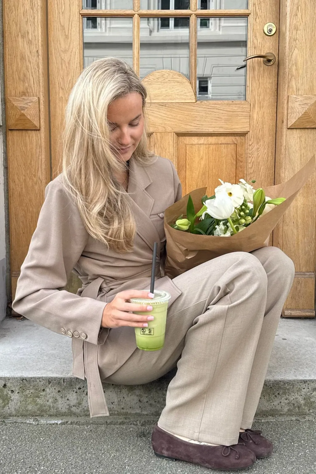 Lysebrun blazer fra BYIC med omslagsdesign og bindebælte i taljen. Blazeren har skulderpuder, lige ærmer og en lille brystlomme på venstre side.