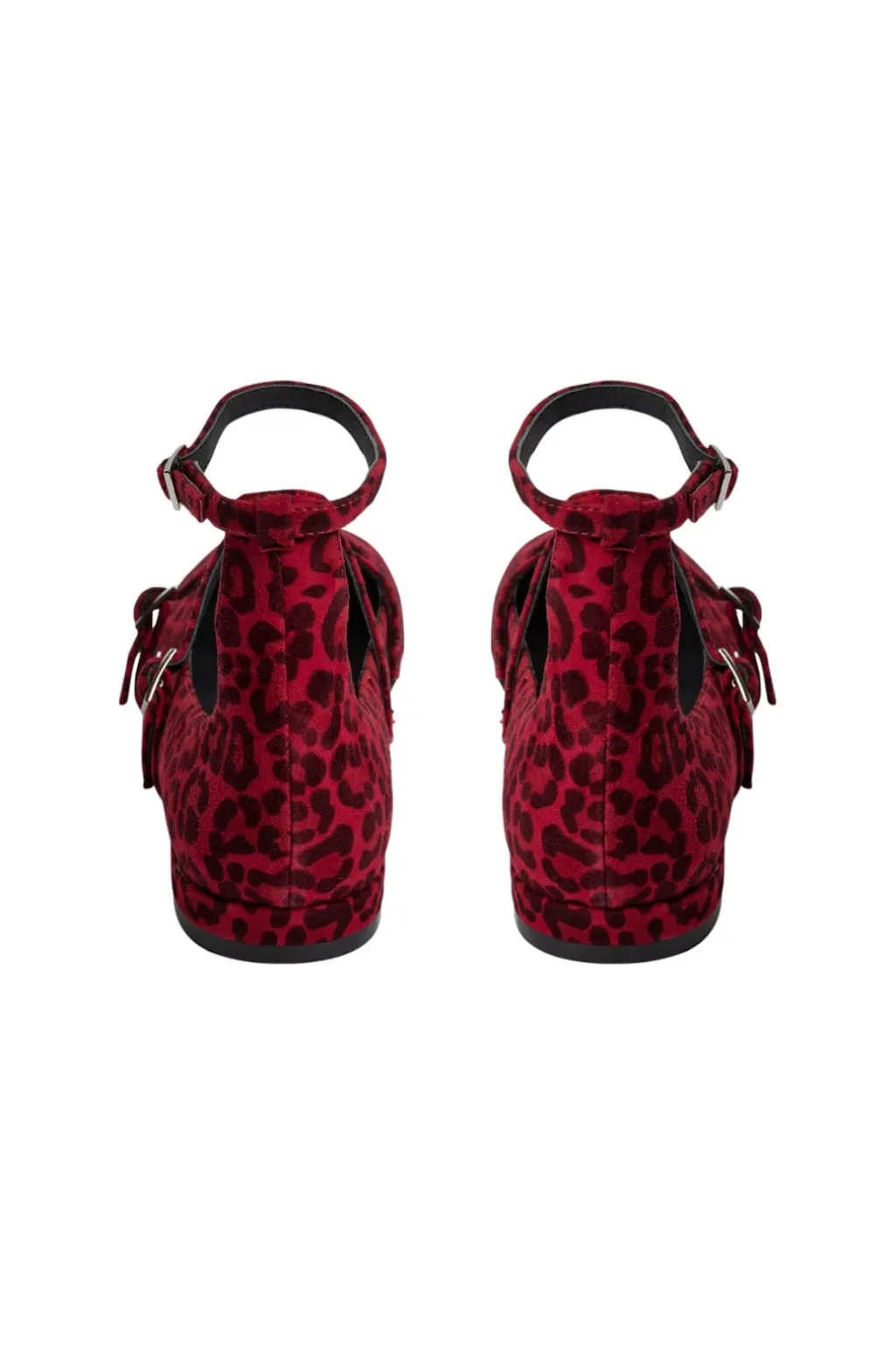 Rød ballerina fra Sofie Schnoor med leopardmønster i ruskind. Skoen har spids tå og spænde-lukning med tre remme over vristen.
