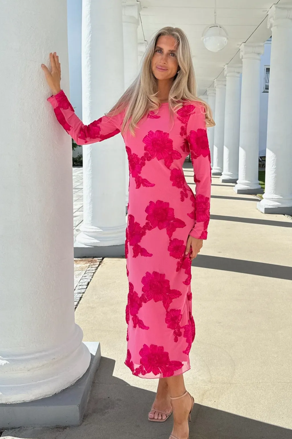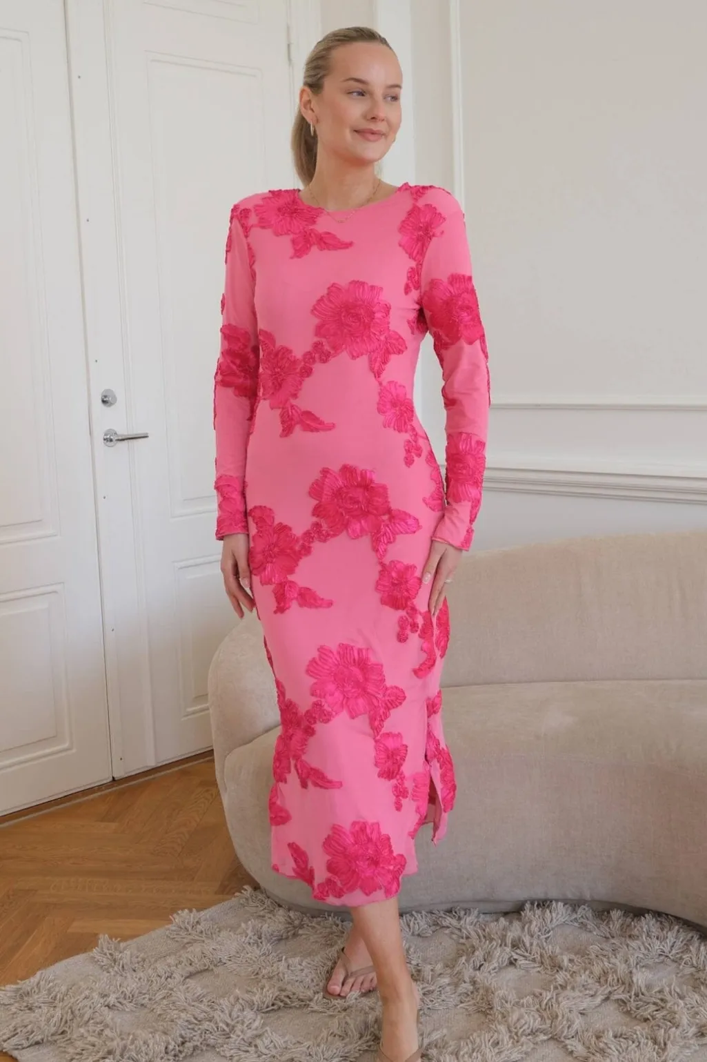 Smuk mesh-kjole i pink med pink 3D-blomsterdetaljer. Kjolen har lange ærmer og en rund halsudskæring. Den har slidser i begge sider, hvilket tilføjer et elegant touch til designet.