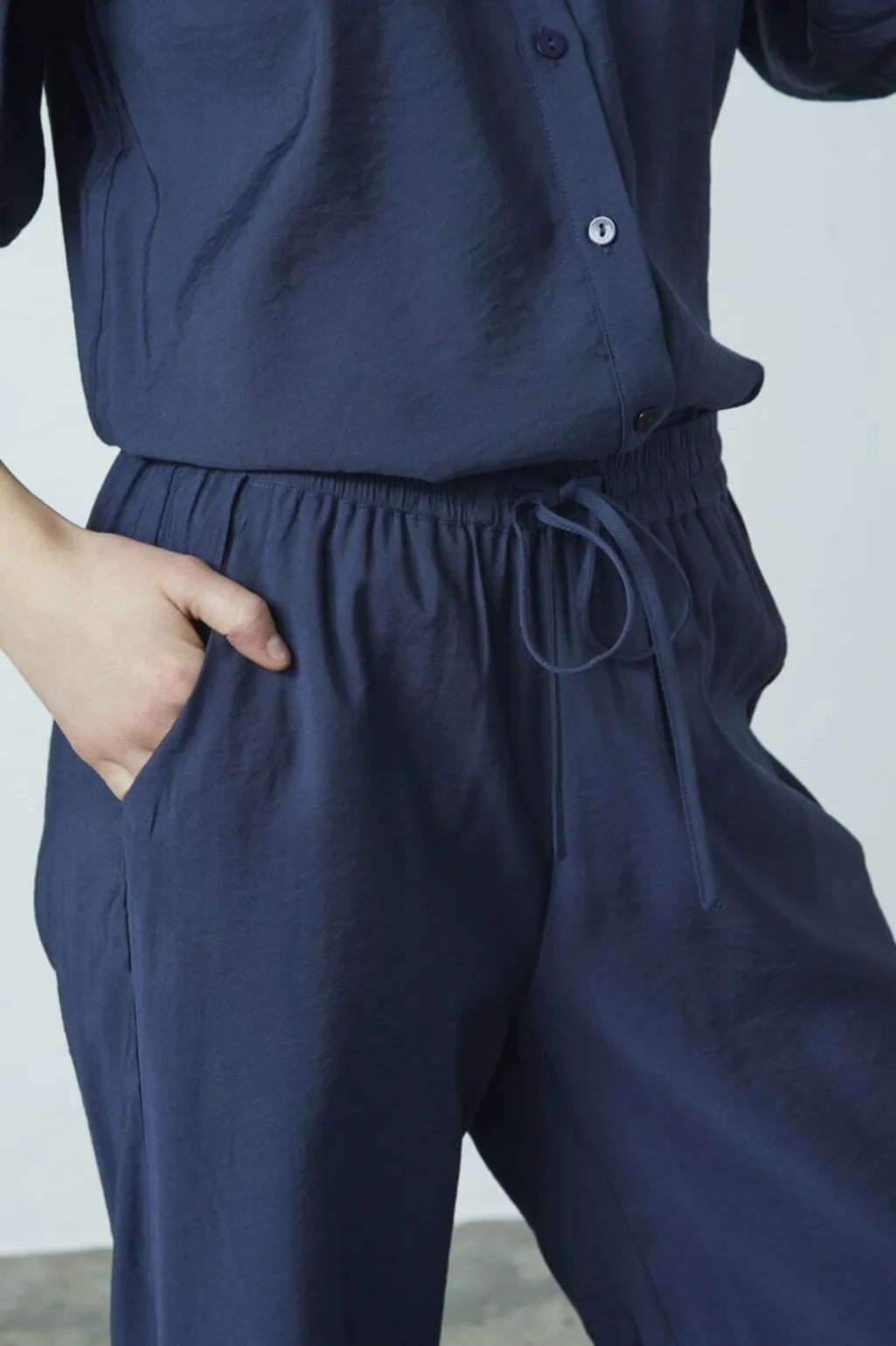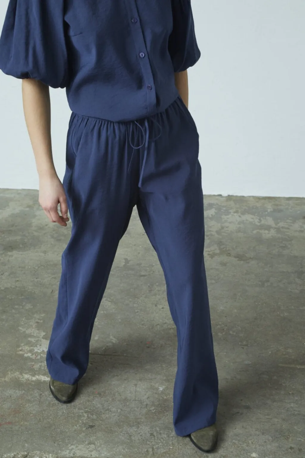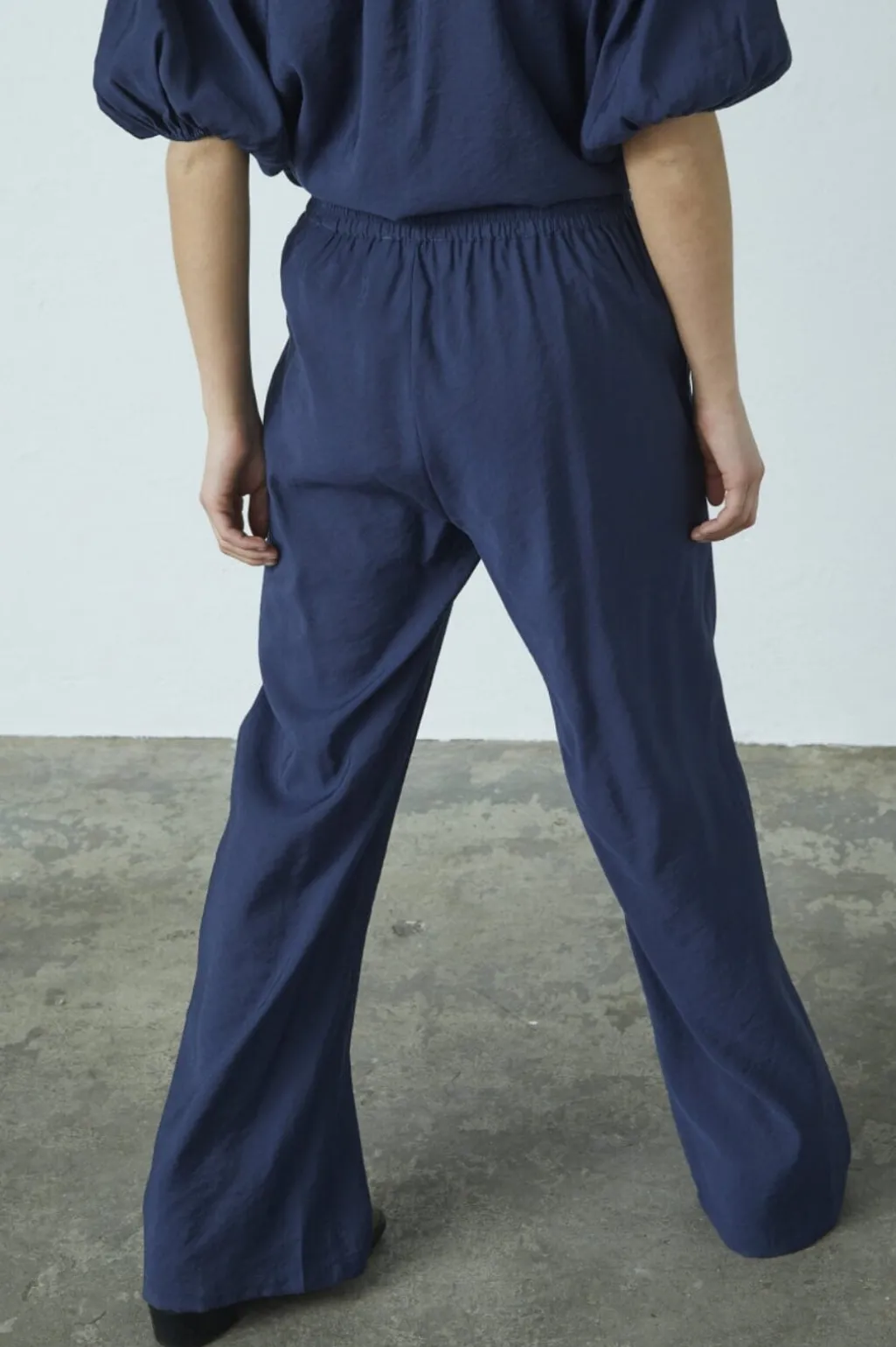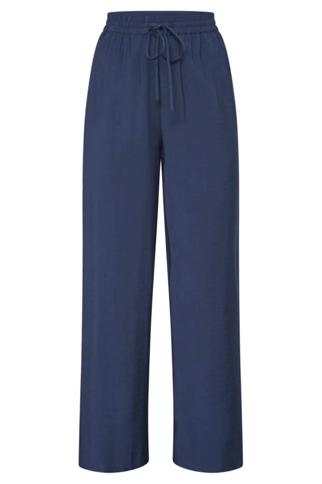 Mørkeblå bukser fra Sisters Point med løs pasform og brede ben. Bukserne har høj talje med elastik og snørelukning samt sidelommer.