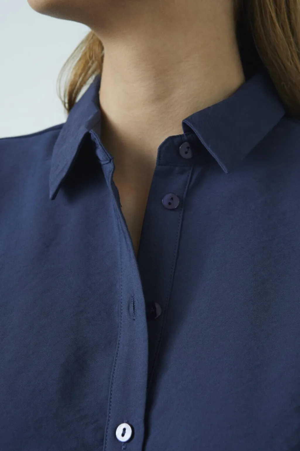 Marineblå skjorte fra Sisters Point med trekvartlange pufærmer og knaplukning. Skjorten har en klassisk skjortekrave og er lavet af en blanding af bambus og polyamid.
