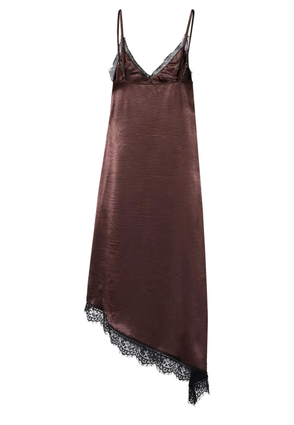 Lang kjole fra Sisters Point i brun og sort med skinnende satinlook. Materialet er lavet af 95% polyester og 5% elastan.