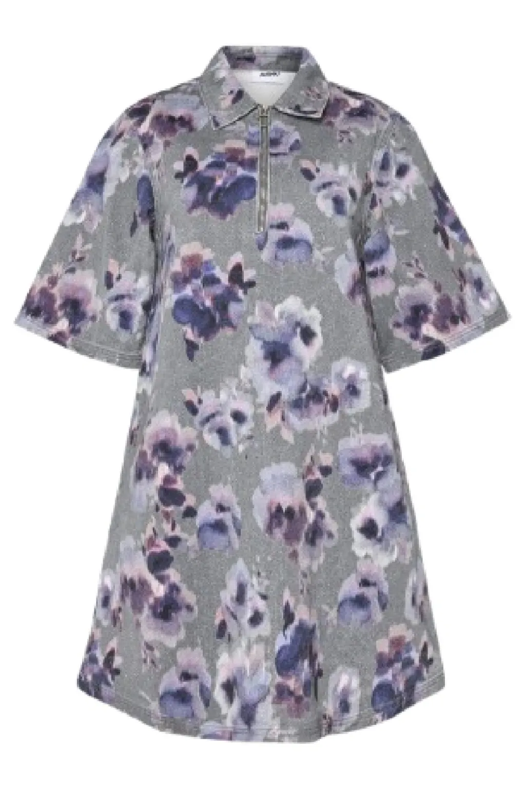 Kjole fra Moves by Minimum i grå med blomstermønster i lilla nuancer. Den har polokrave og korte ærmer med lynlås i halsen.
