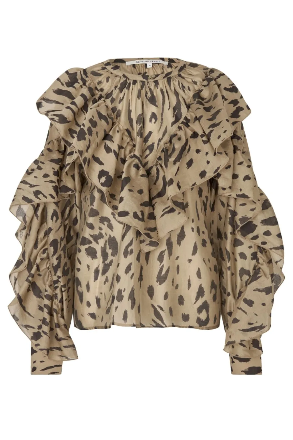 Bluse fra Second Female i en khaki grøn nuance med animalprint. Blusen er fremstillet af semitransparent materiale med et gennemgående mønster.