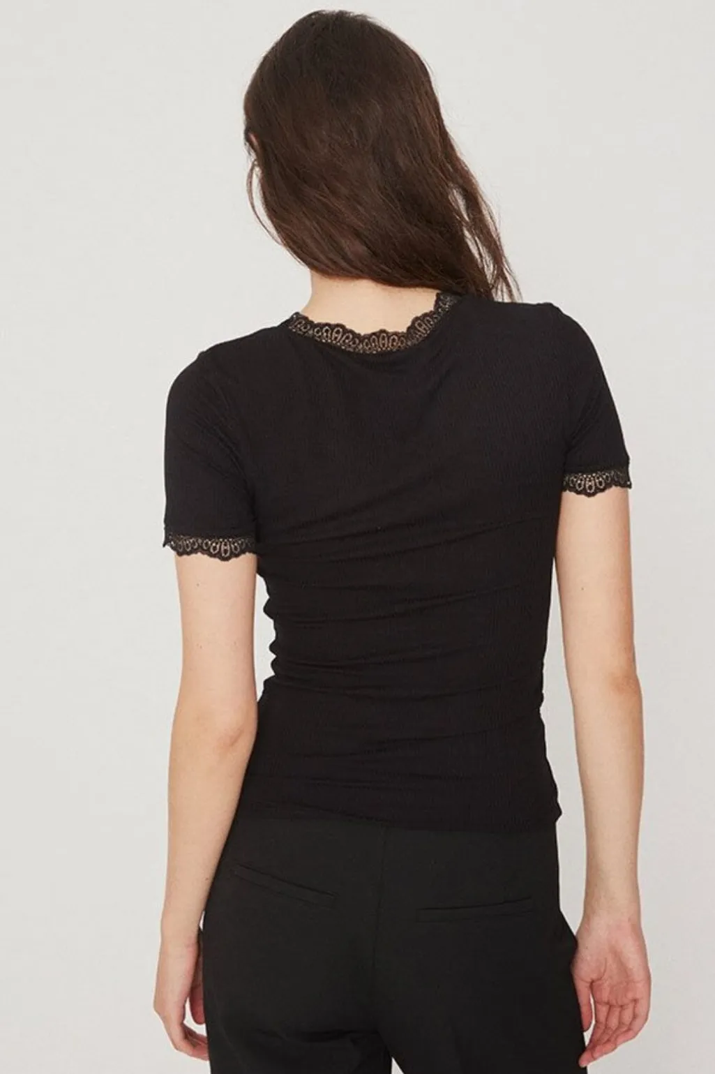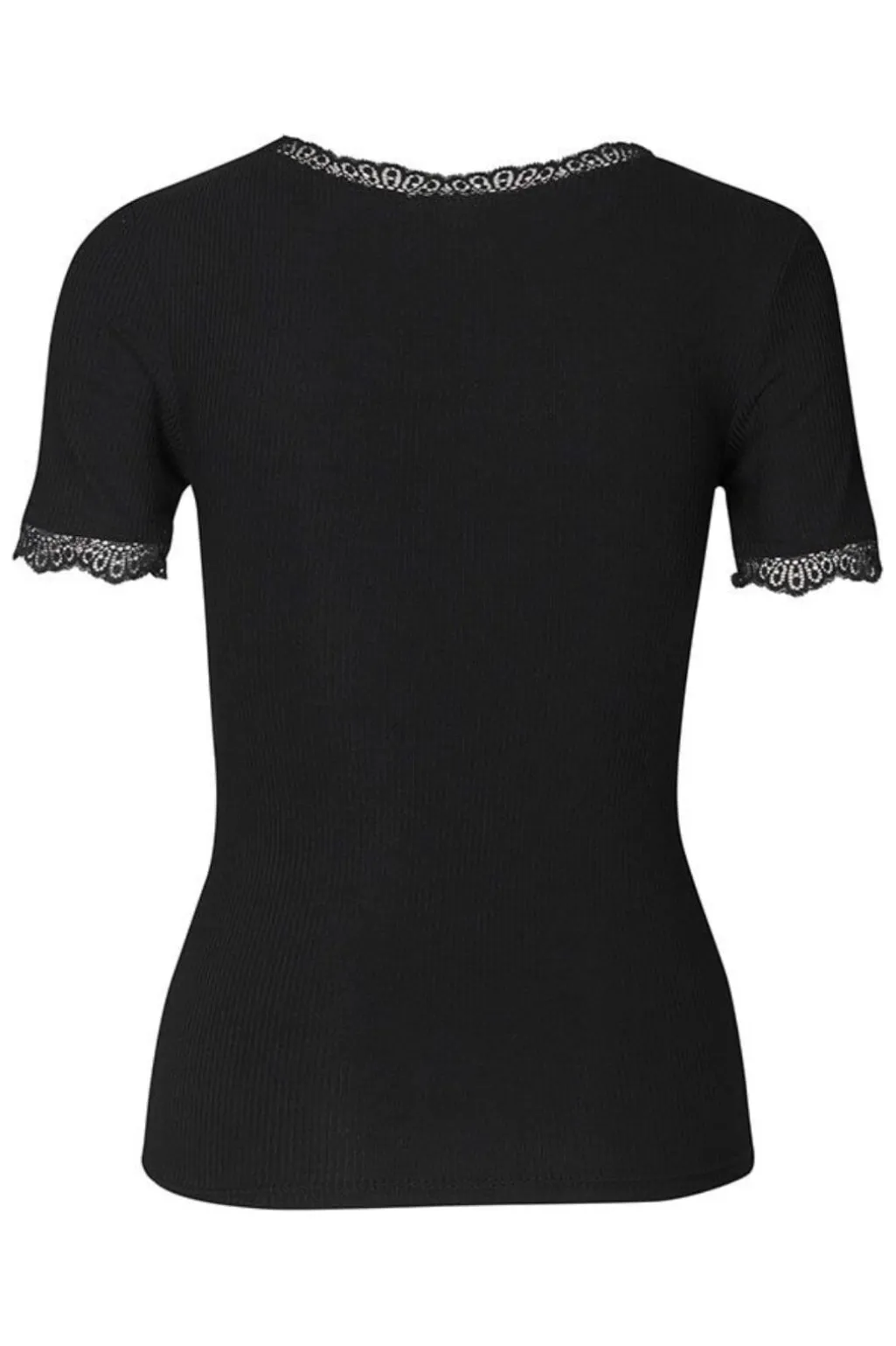 Sort t-shirt fra MbyM med ribbet tekstur. T-shirten har blondekanter ved halsen og ærmerne, slim fit pasform og kort ærmelængde med rund halsudskæring.
