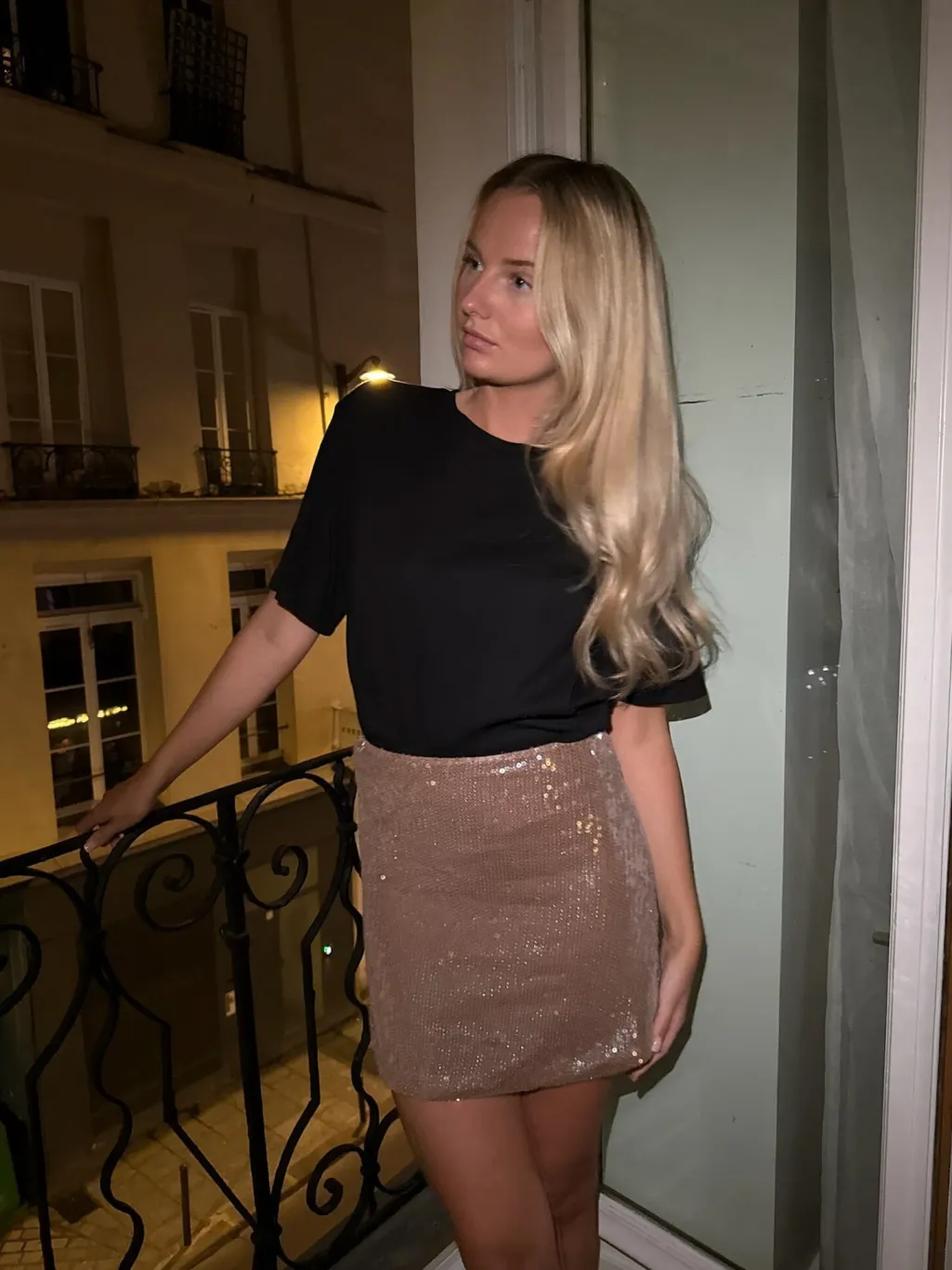 Fitted mini-nederdel med for i et strækbart lysebrunt pailletstof med stretch og en usynlig lynlås i ryggen.Passer til størrelsen.Håndvaskes kun.Vær opmærksom på, at dette stykke er delikat og unikt, og derfor kan have individuelle skønhedsfejl. Vi anbefaler, at du behandler det med ekstra kærlighed og omhu.