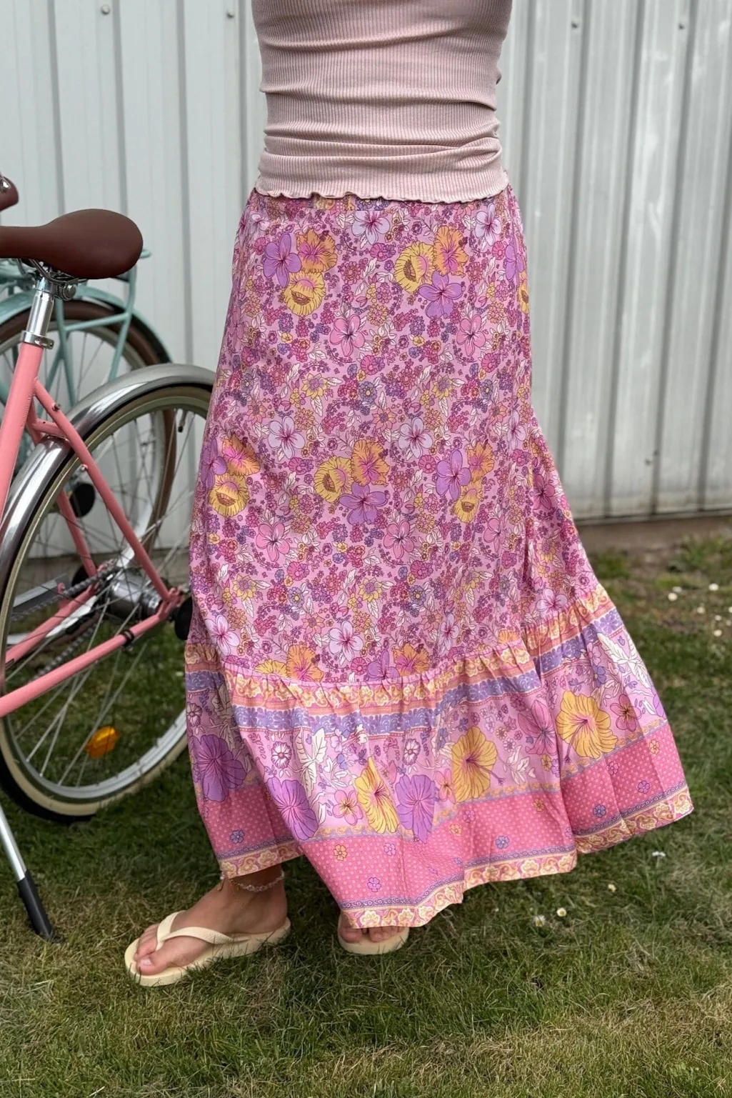 Pink maksiskørt fra Dear Molly med blomstermønster i pink og lilla nuancer. Skørtet har en løs pasform og en flæsekant forneden, der giver et blødt og feminint udtryk.