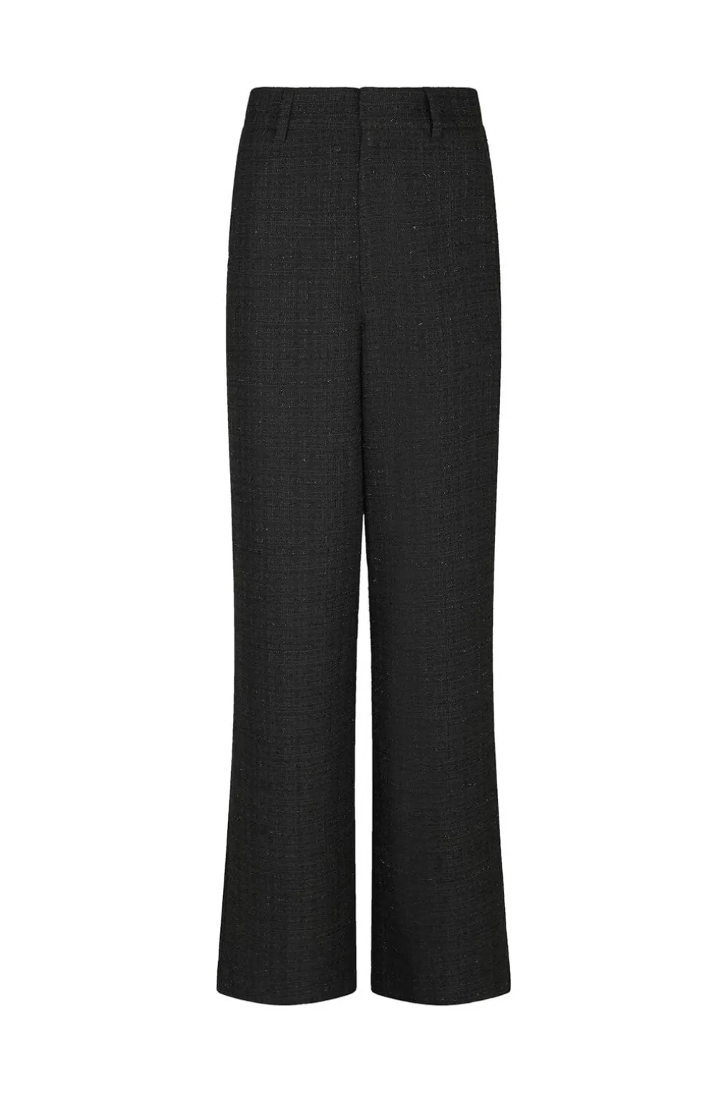 Sorte bukser fra Neo Noir i boucle-stof med en karakteristisk, struktureret overflade. Bukserne har en høj talje og en løs pasform med brede ben.