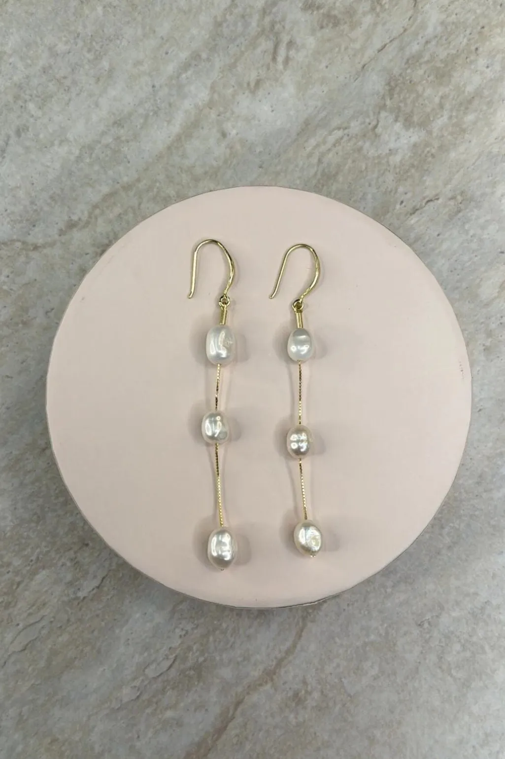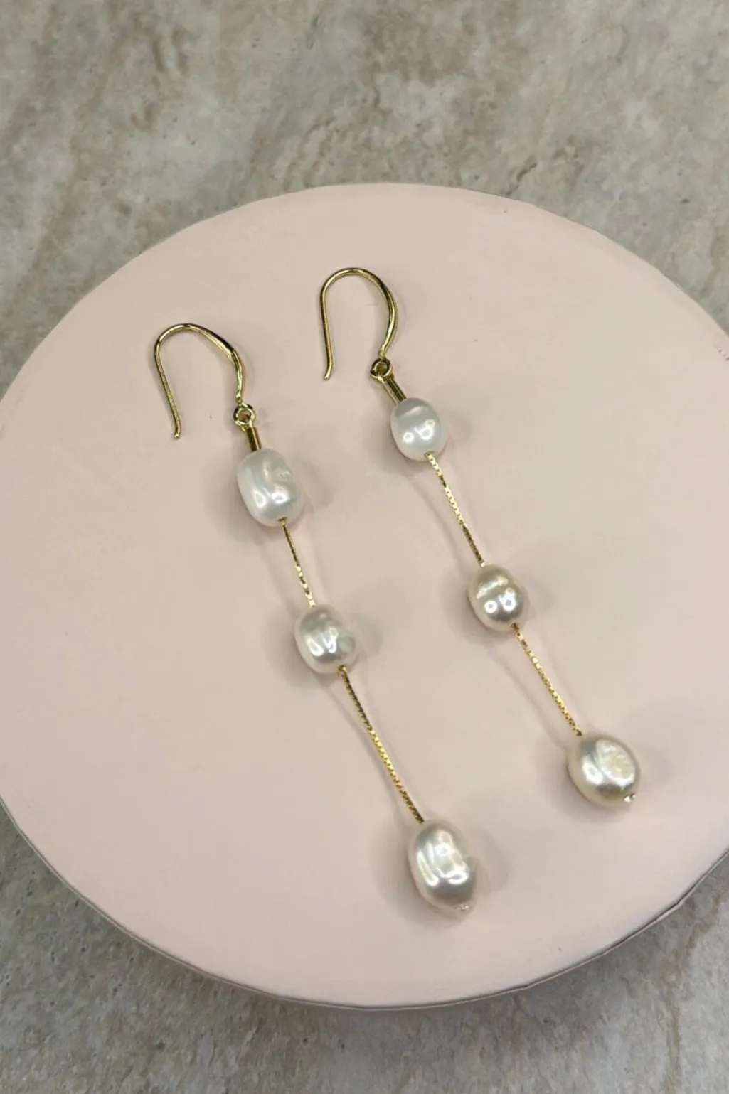 Øreringe fra Molly&My Jewellery med tre hvide, ovale ferskvandsperler forbundet med en tynd, guldfarvet kæde på hver ørering.