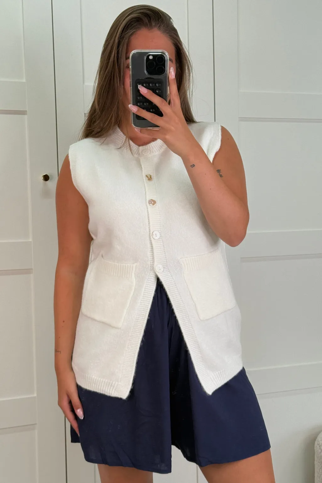 Hvid vest fra A-bee, lavet af en blanding af genanvendt polyamid, uld og akryl. Vesten har knapper foran og to lommer.