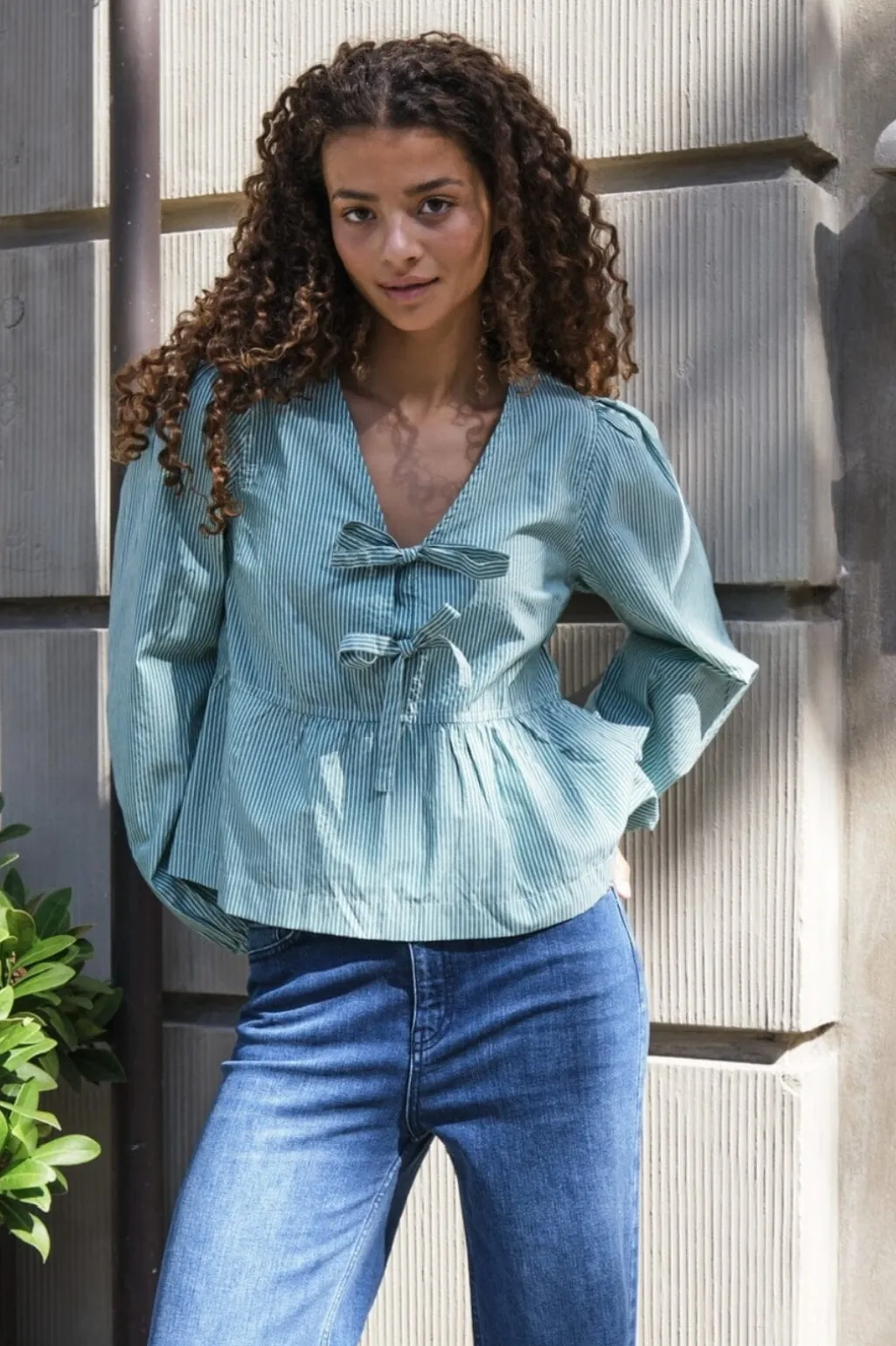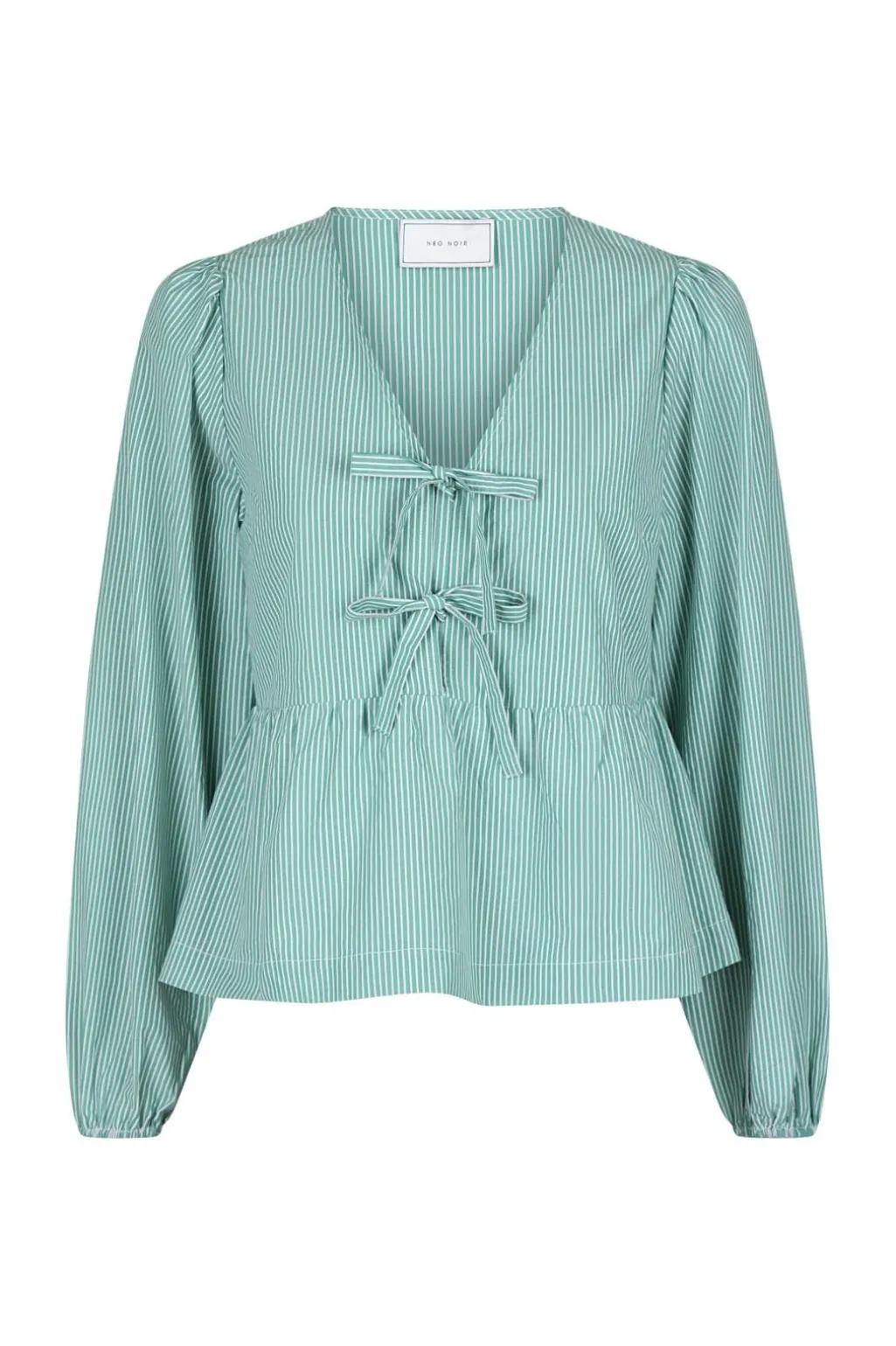 Grøn stribet bluse fra Neo Noir med peplum-design og flæser. Blusen har en v-halsudskæring og sløjfedetaljer, der giver den et personligt præg.