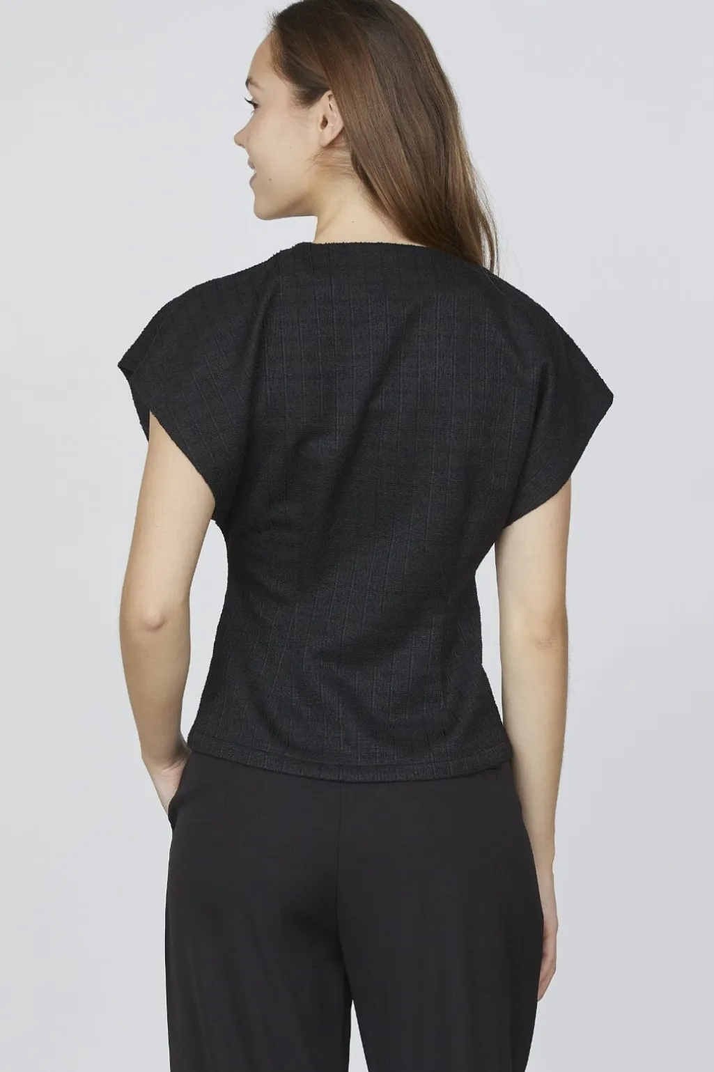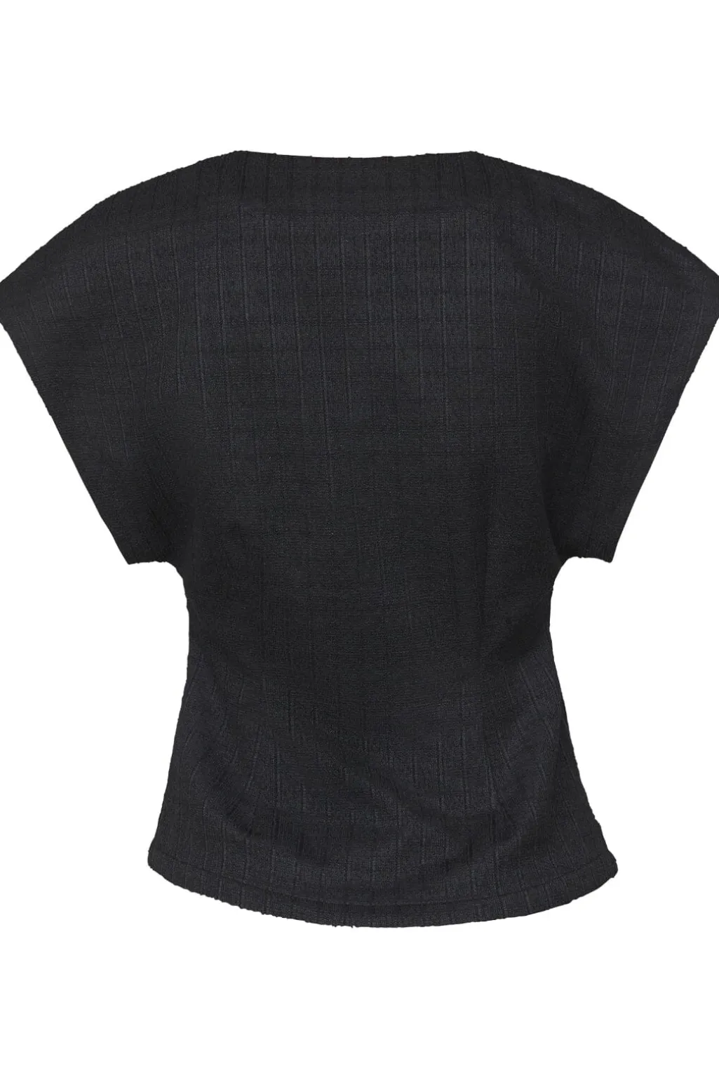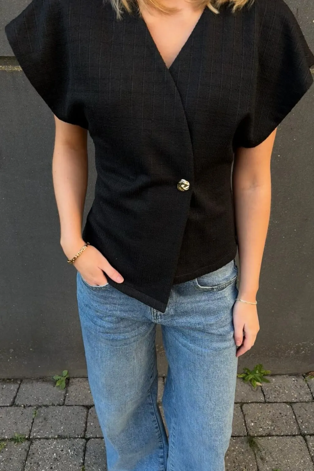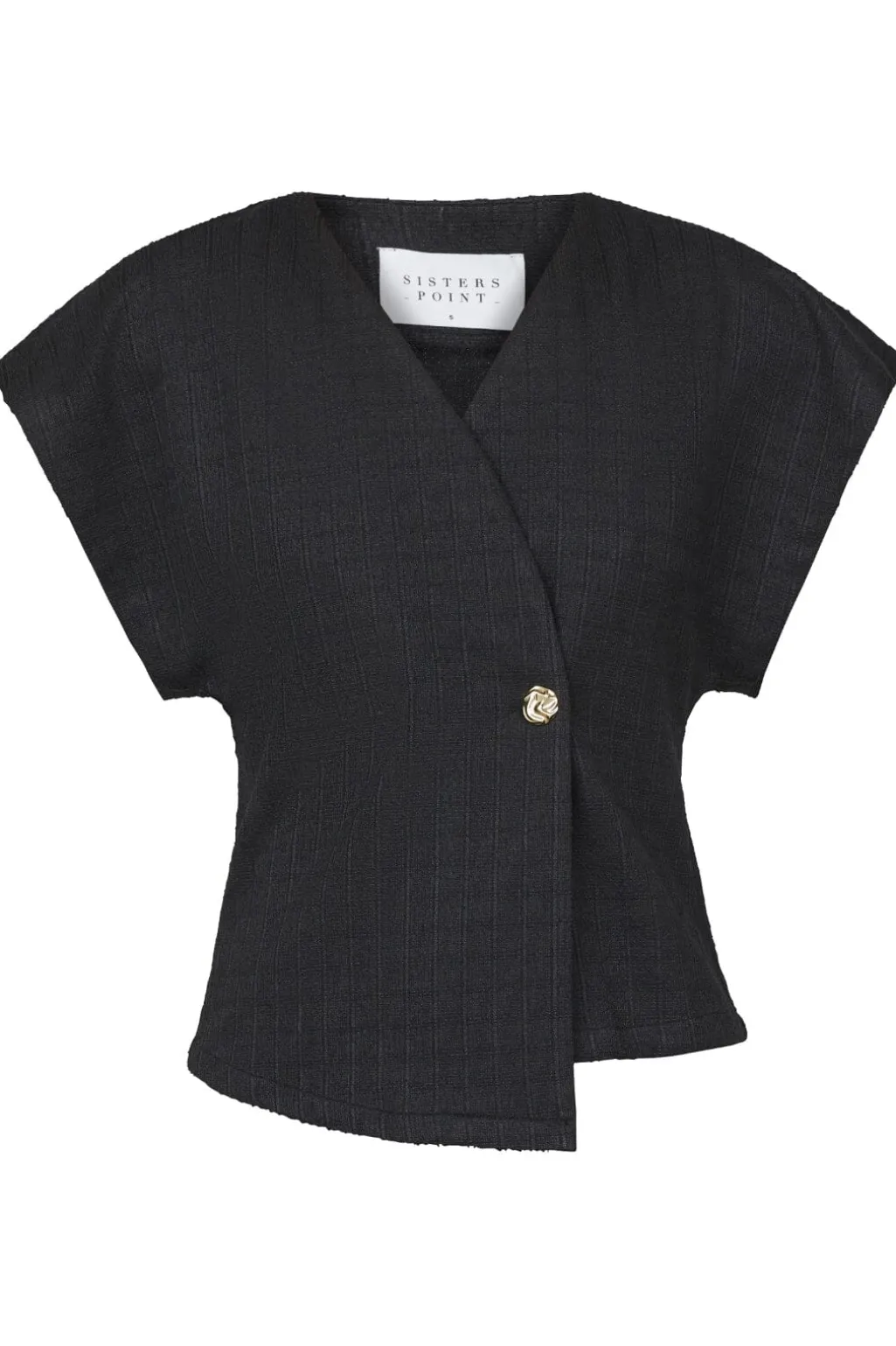 Sort vest fra Sisters Point med asymmetrisk slå-om-design. Den har korte kimonoærmer og en V-halsudskæring, der giver vesten et let udtryk. En guldknap ved taljen samler designet.