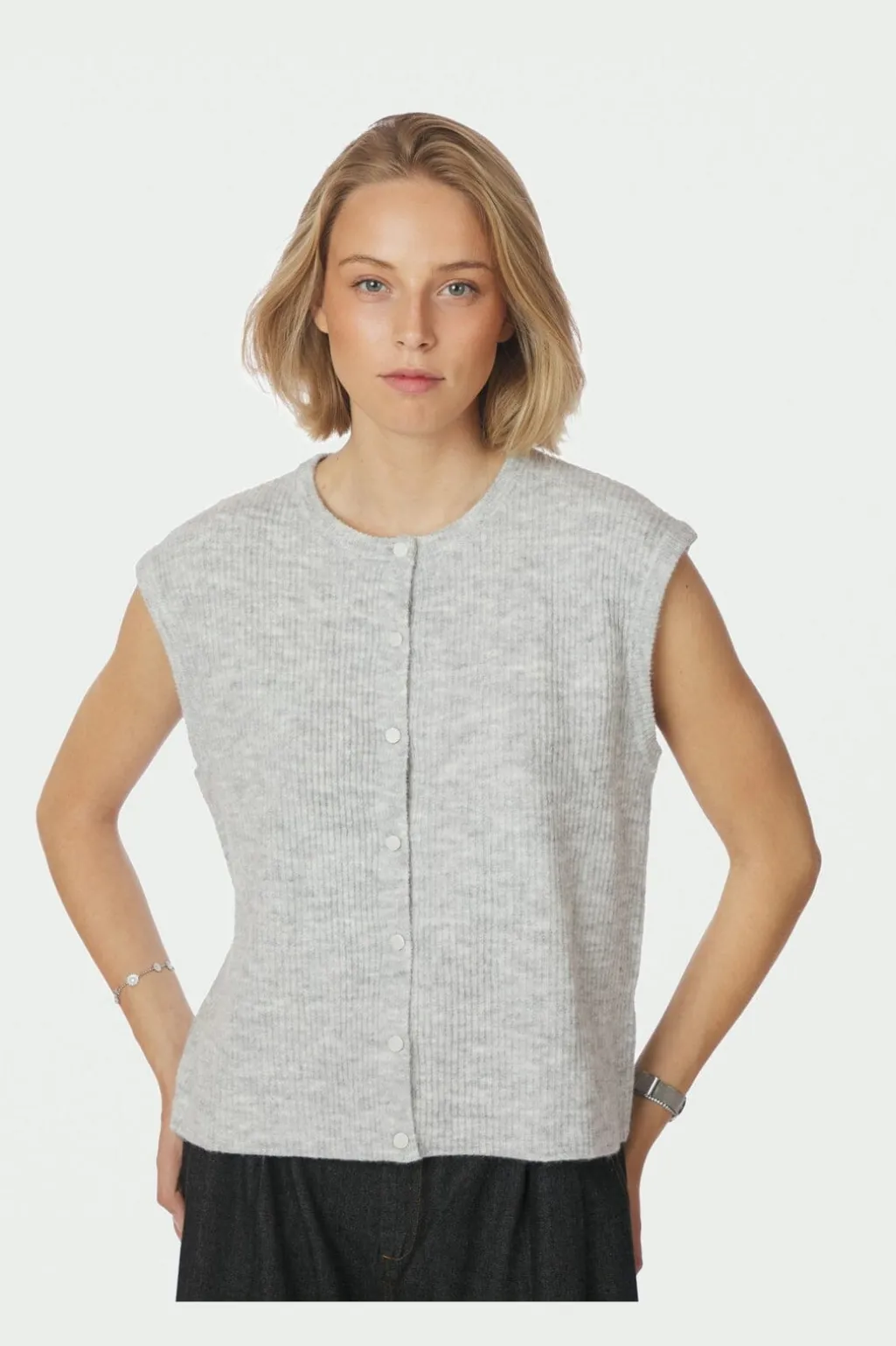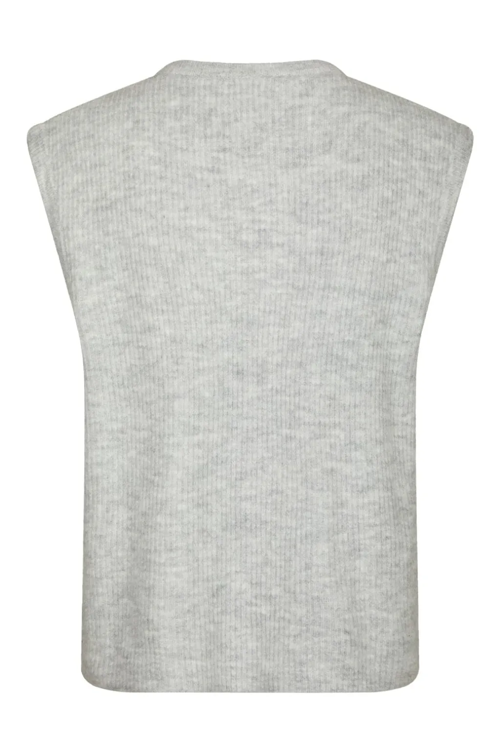 Strikket vest fra Neo Noir i lys grå melange. Vesten har en ribbet tekstur og knaplukning foran. Den løse pasform giver god bevægelsesfrihed.