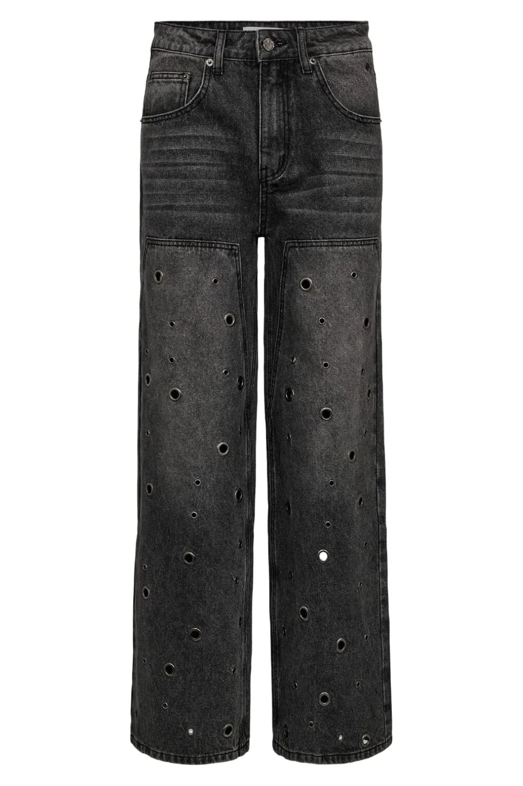Jeans fra Haute L’Amitié med stenvask i grå nuancer og øjenlågspatches på forsiden af benene. Jeansene har en løs pasform og en lang længde.