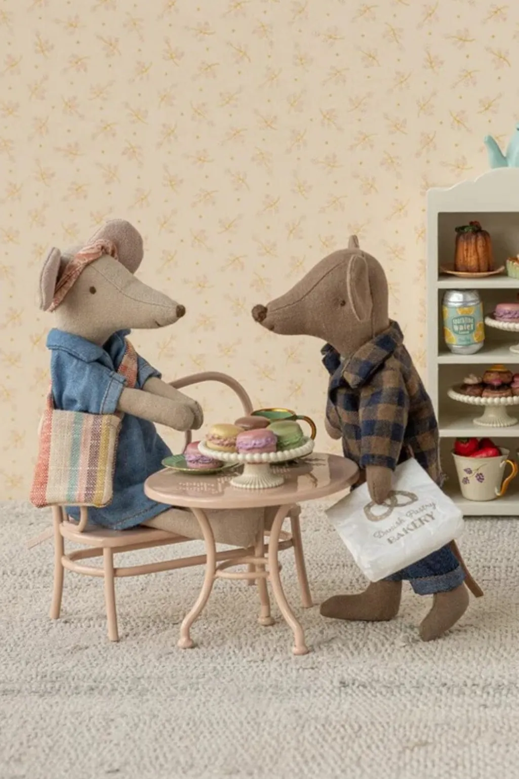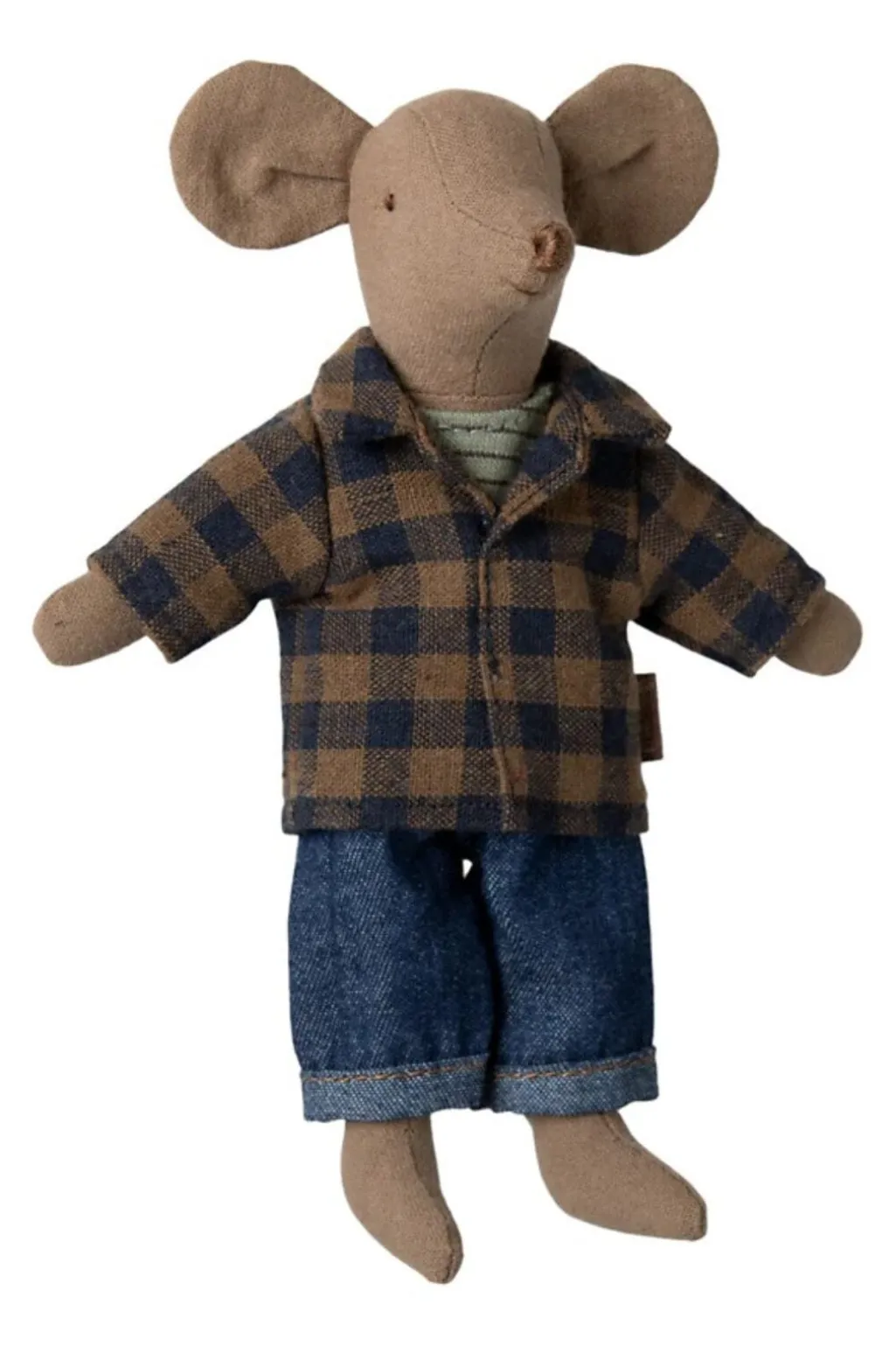 En lysebrun mus fra Maileg med store ører og enkle ansigtstræk. Musen har en ternet skjorte, en tanktop og denimbukser med opsmøg.