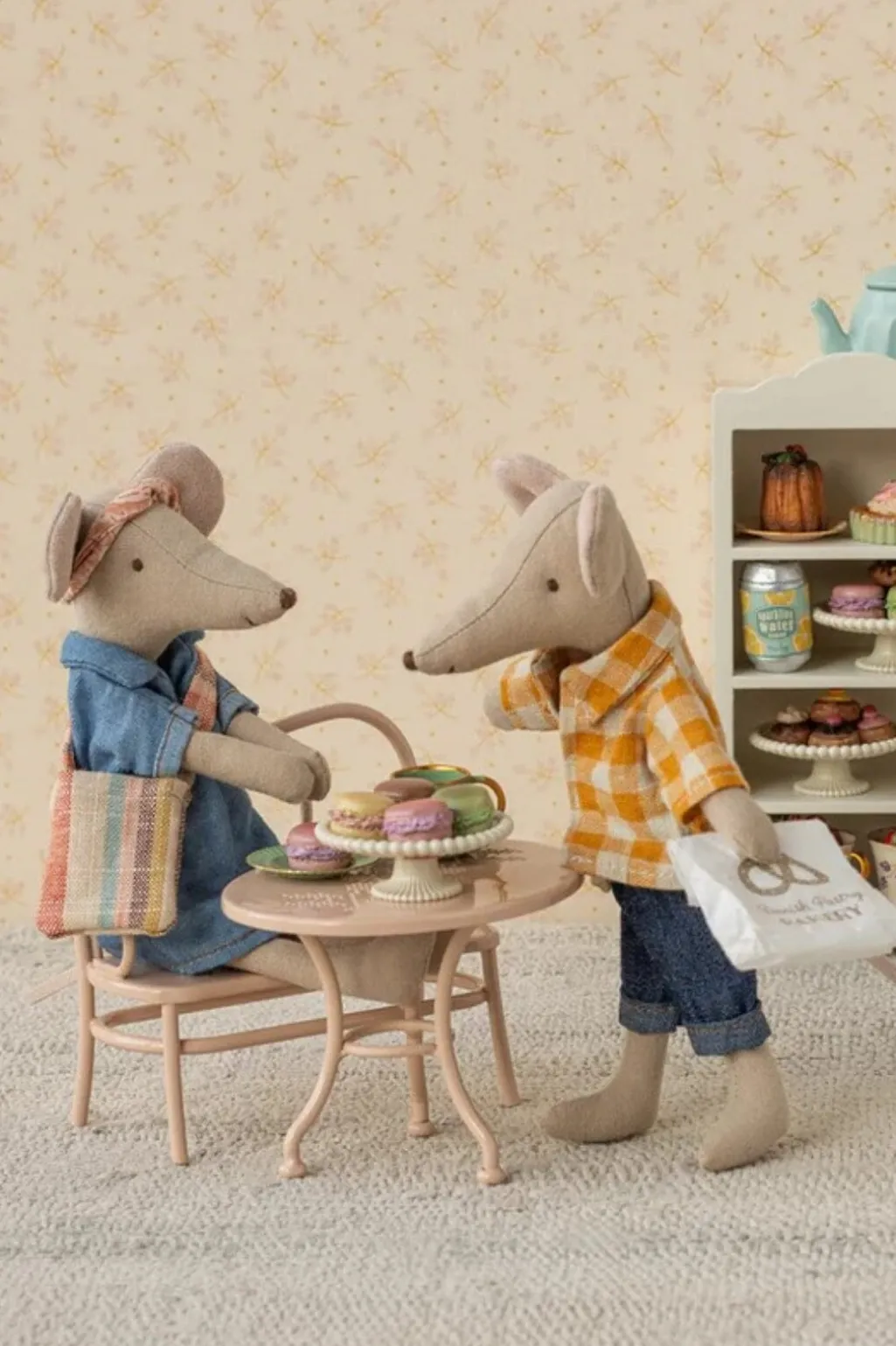 Musefigur fra Maileg med ternet skjorte og denim-bukser. Figuren passer sammen med andet Maileg-legetøj og møbler i musestørrelse til kreativ leg.