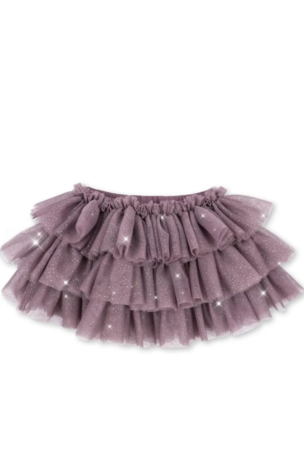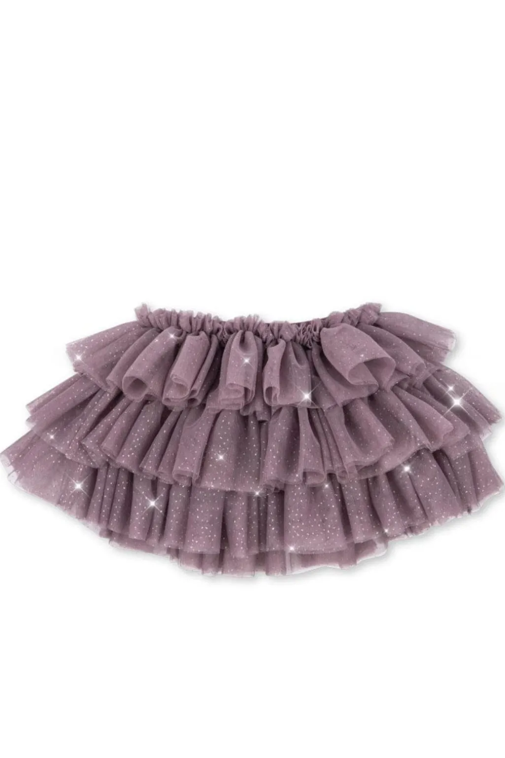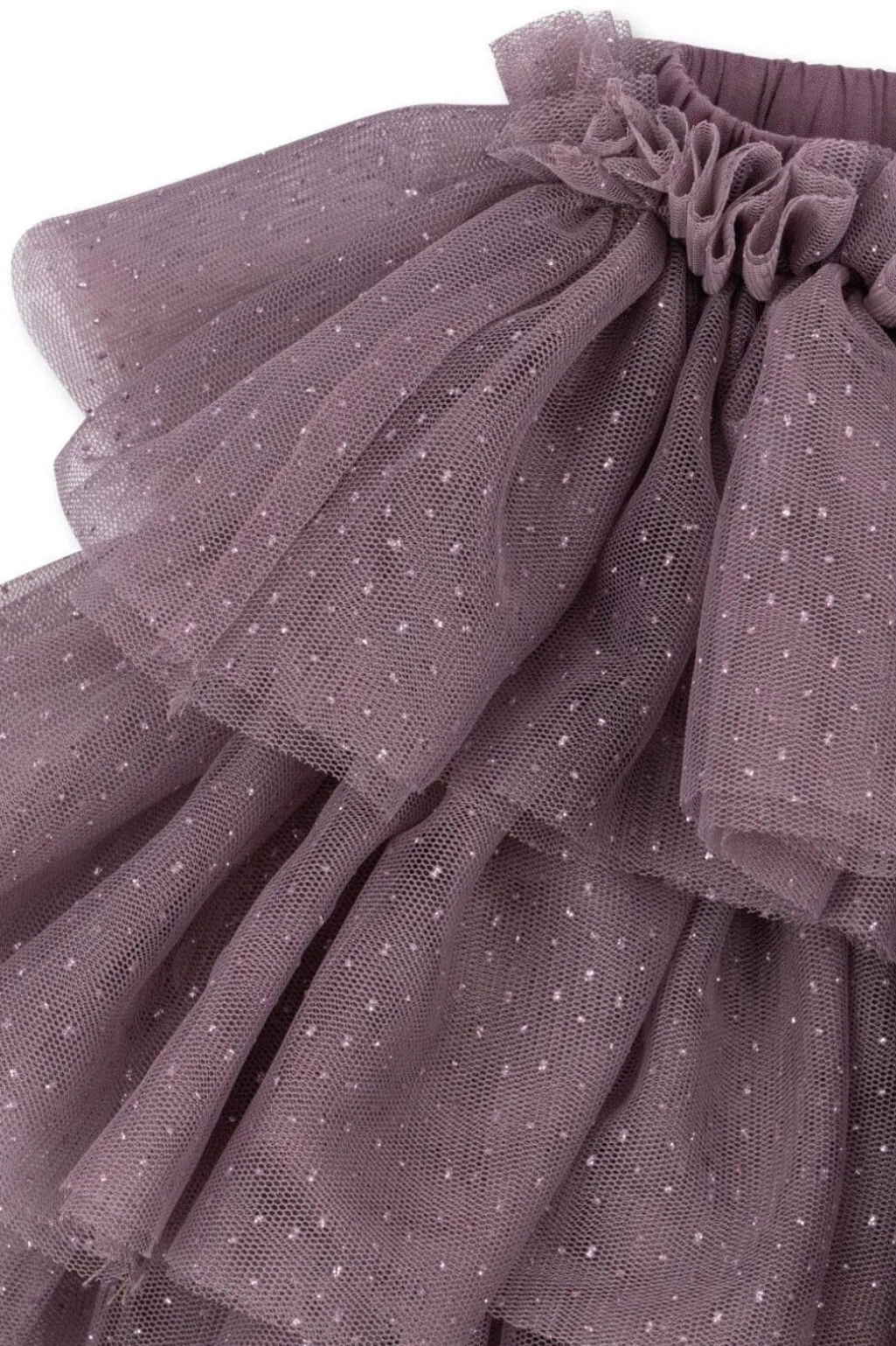 Nederdel fra Konges Sløjd, lavet af genanvendt polyester med bomuldsforing. Den lilla farve har små glitrende prikker.