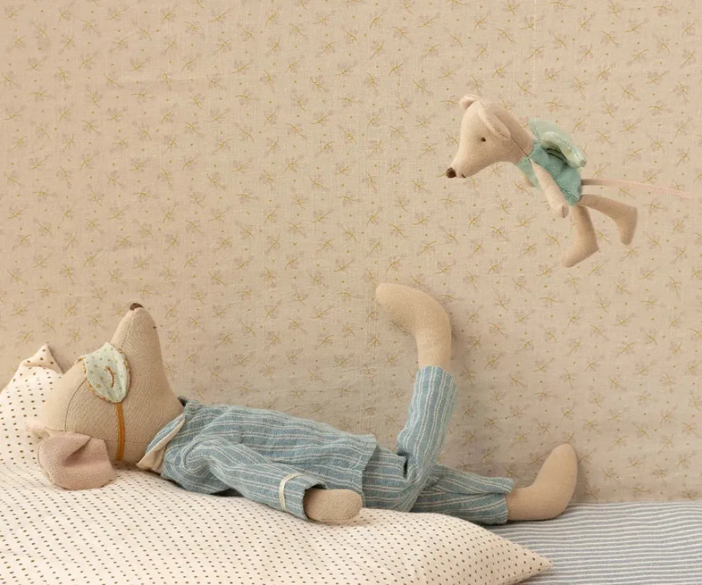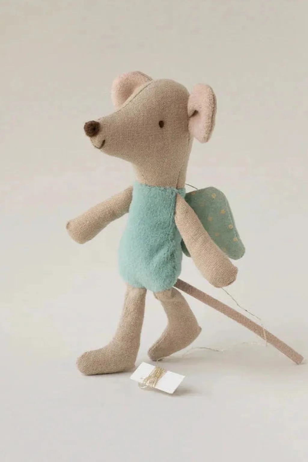 En fe-mus fra Maileg med en lyseblå dragt og mintgrønne vinger med prikker. Musen har en lang hale og en lille snude.