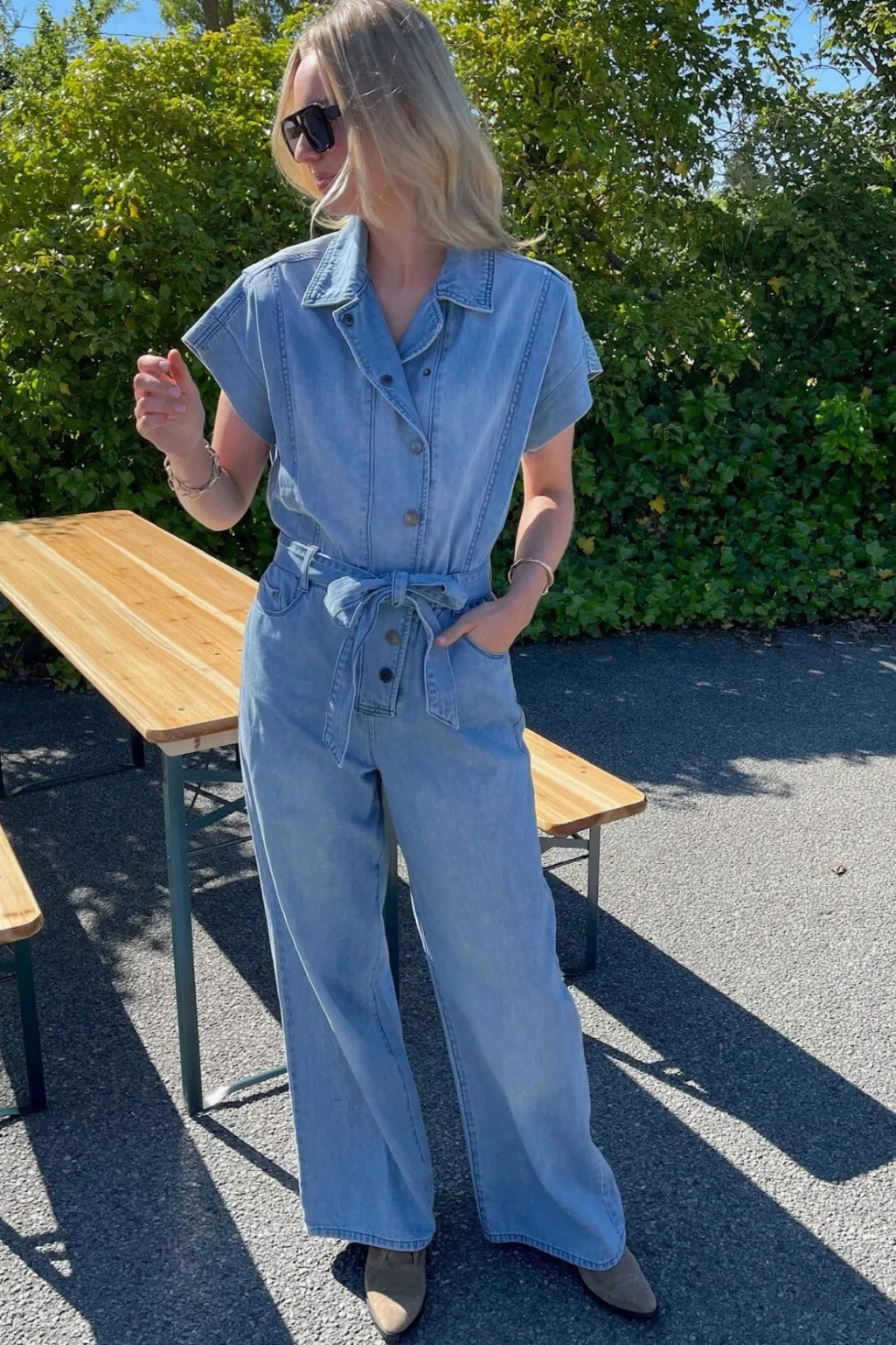 Lys blå denim jumpsuit fra Sisters Point med skjortekrave og korte ærmer. Jumpsuiten har en løs pasform og går til anklerne.