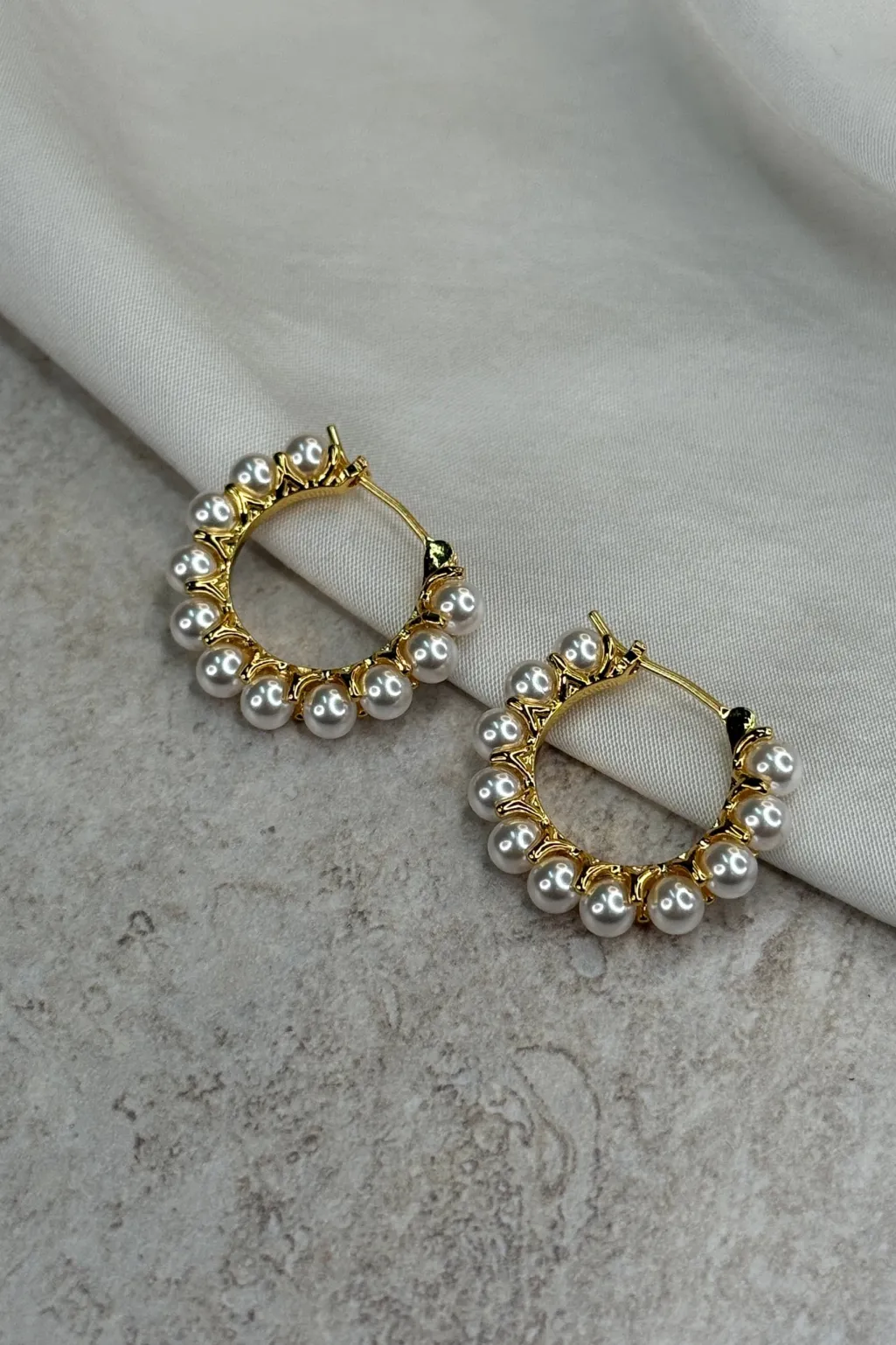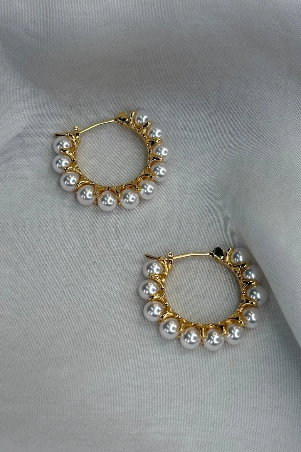 Hoop-øreringe fra Molly&My Jewellery med et cirkulært design. Øreringene har en guldtonet finish og er dekoreret med perlelignende kugler rundt om hver hoop.