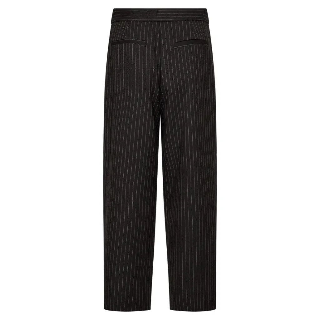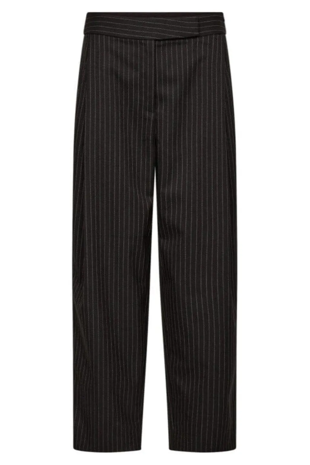 Mørkebrune bukser fra Co’Couture med nålestribet mønster. Bukserne har en høj talje og løs pasform med lige ben, hvilket giver god bevægelsesfrihed.