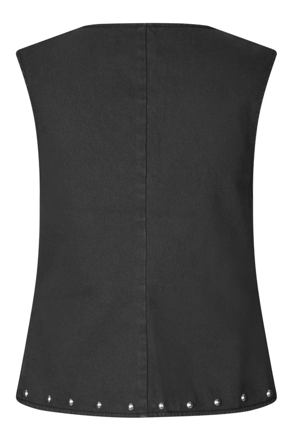 Ærmeløs vest fra Global Funk i vasket sort bomuld. Vesten har en V-udskæring, perledetaljer langs kanten og en snørelukning i midten. To praktiske lommer fuldender designet.