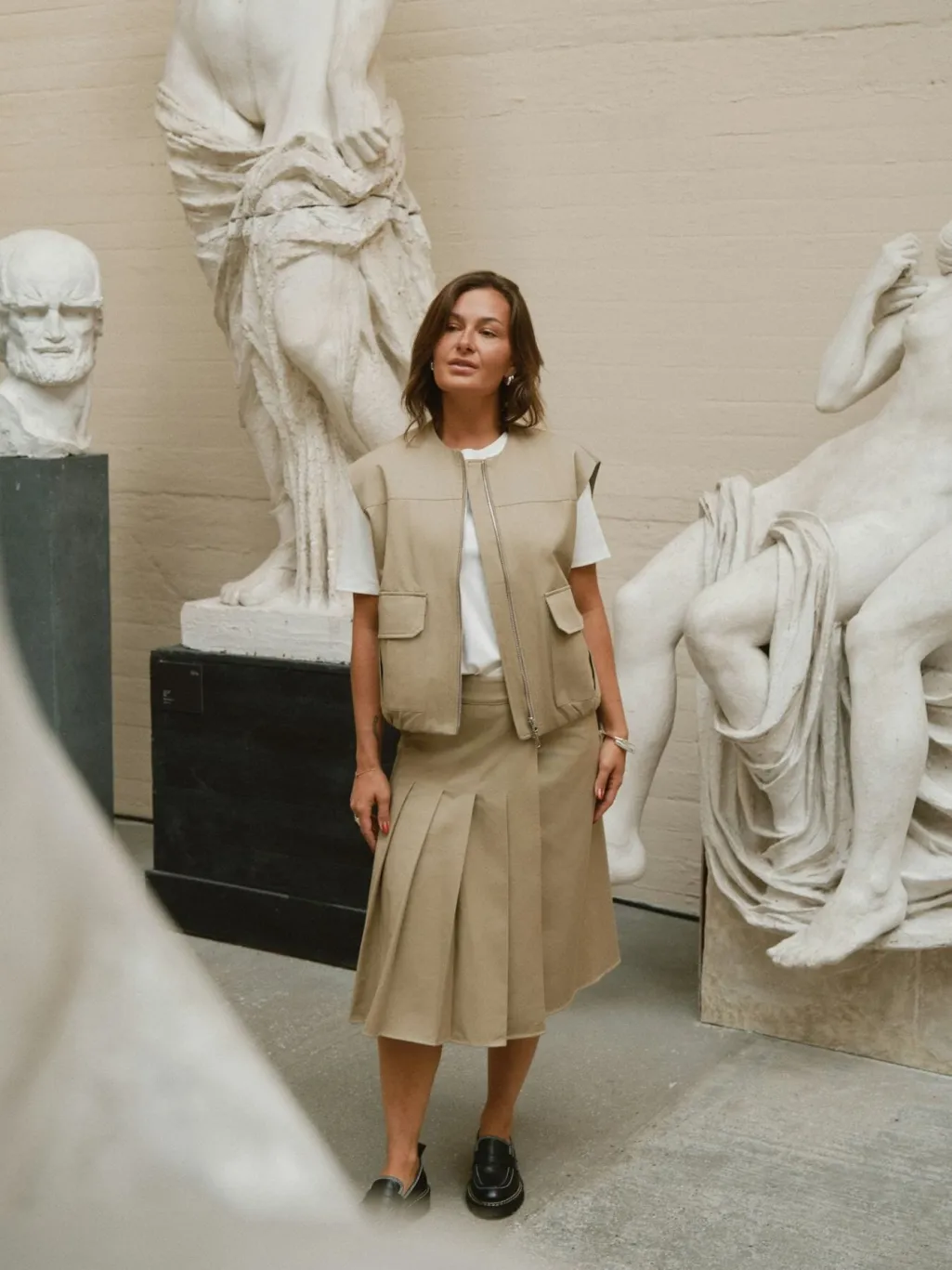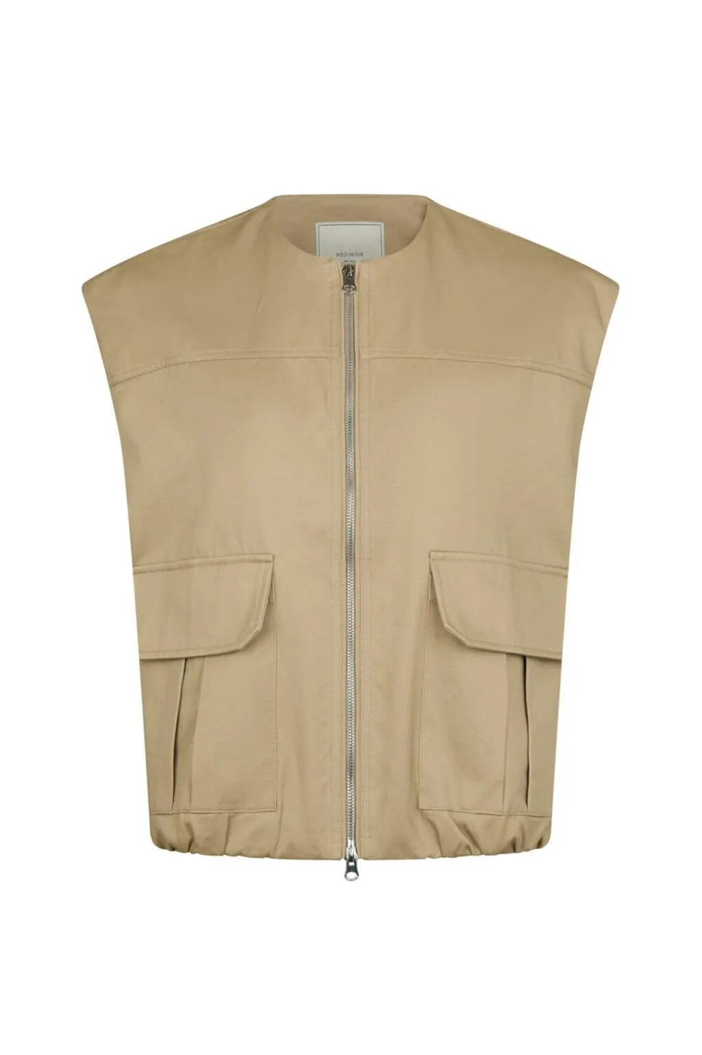 Ærmeløs vest fra Neo Noir i taupe. Den har en oversize pasform med ballon-effekt og store cargo-lommer på forsiden. Lynlås lukning og rund halsudskæring.
