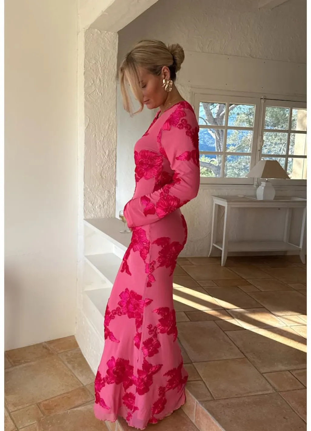 Gulvlang kjole fra BYIC i pink mesh med 3D-blomsterdetaljer. Kjolen har en tætsiddende pasform med lange ærmer og åben ryg. Flæsekanter afslutter designet.