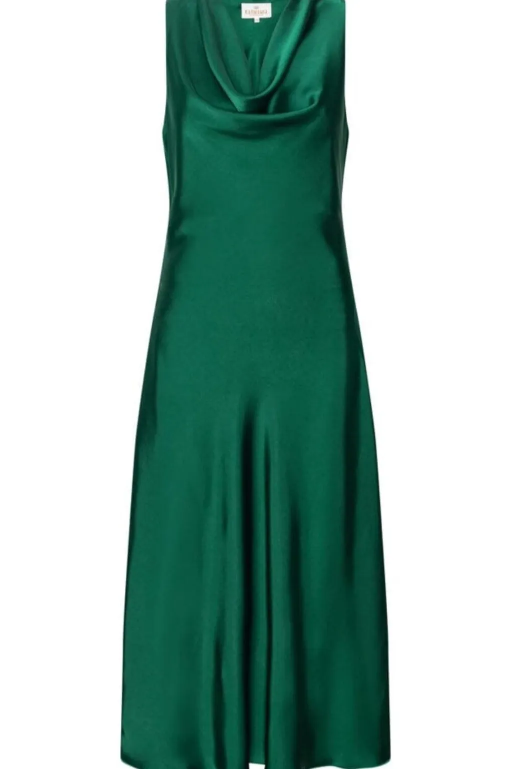 Grøn kjole fra Karmamia i skinnende satin med ankellængde. Kjolen har en draperet halsudskæring og en indsnævret talje, der følger kroppens form.