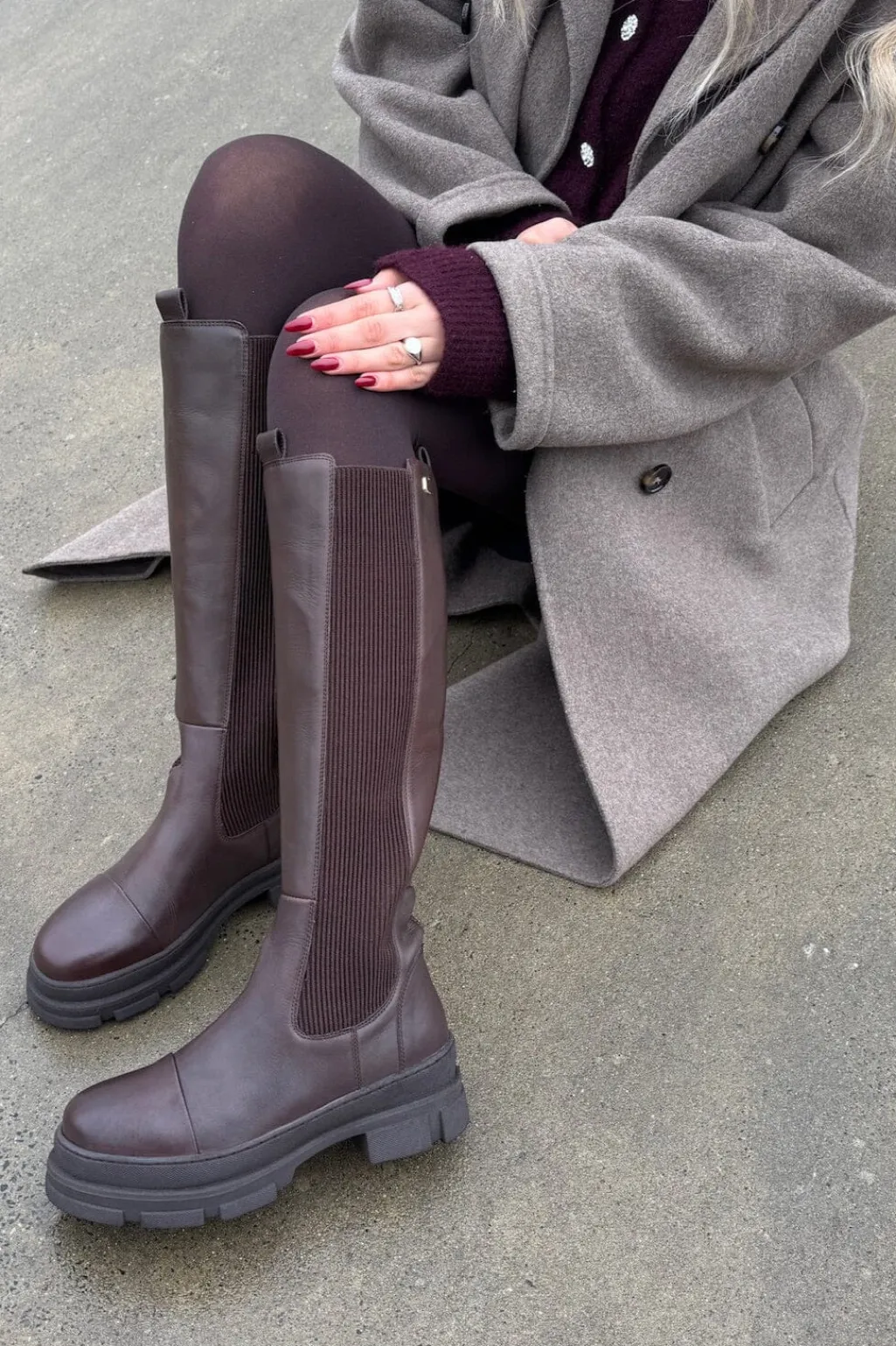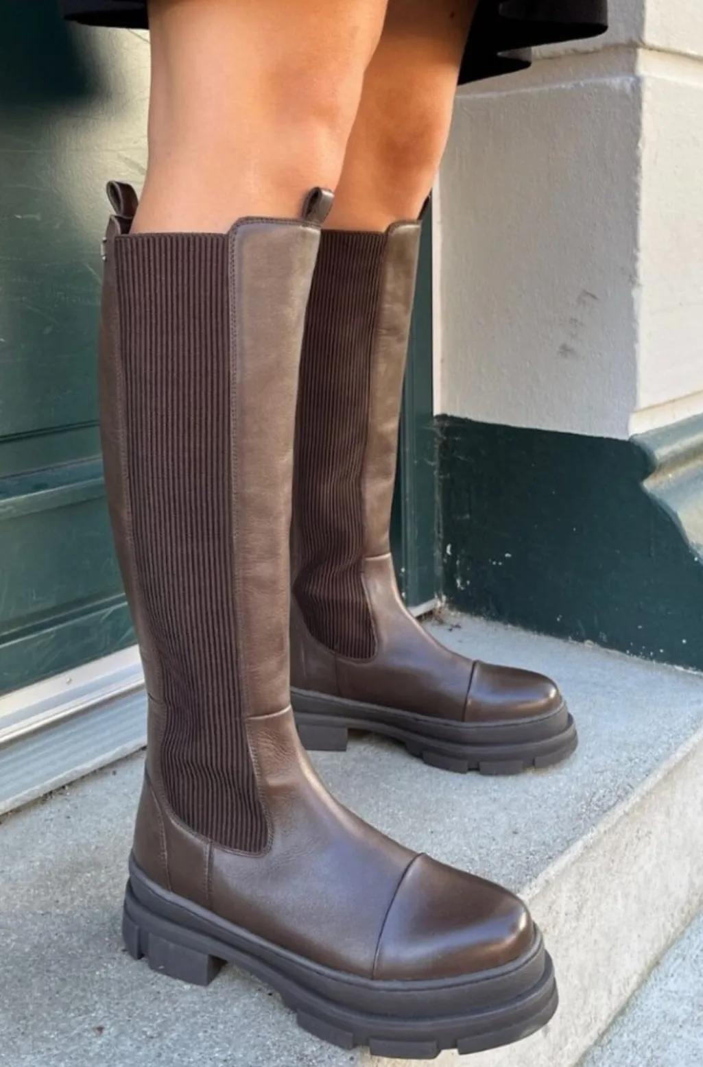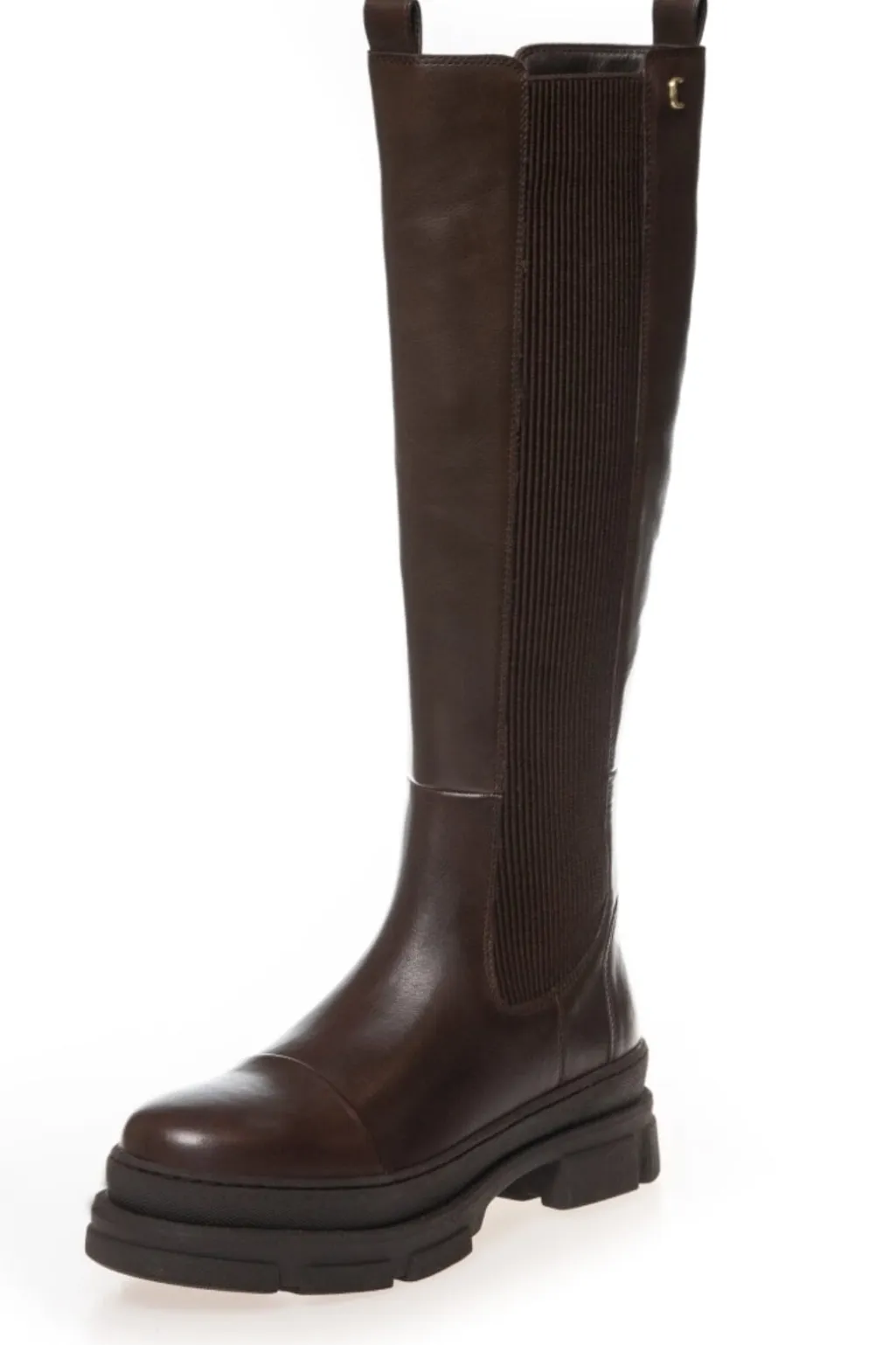 Mørkebrune knæhøje støvler i læder med elastiske sider. Støvlen har en rund tå og en kraftig sål med blokhæl.