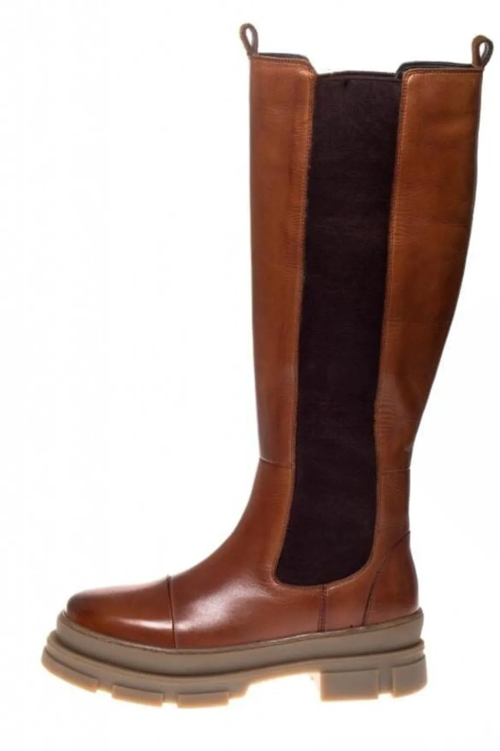 Knæhøje støvler i cognacfarvet læder med mørke elastikpaneler på siderne. TPR-sålen har et chunky design, der giver god støtte til foden.