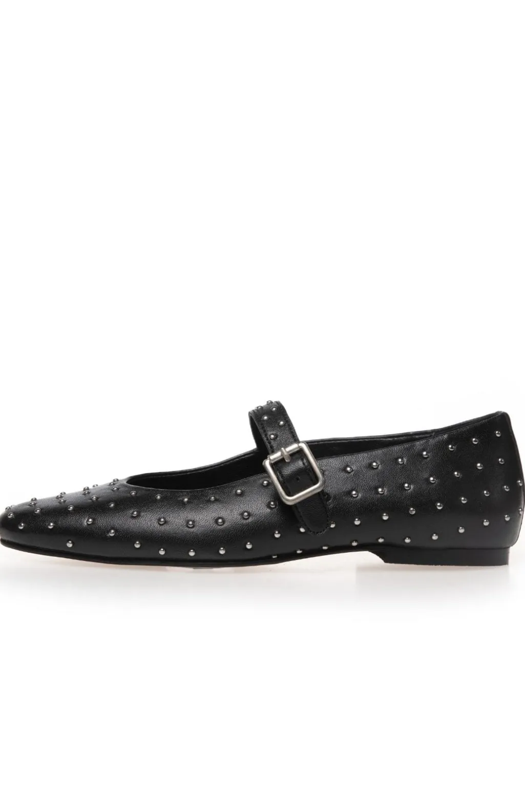 Sort ballerina i læder med perledetaljer og remlukning. En sko med rund tå og praktisk spænde, der giver mulighed for at justere pasformen.