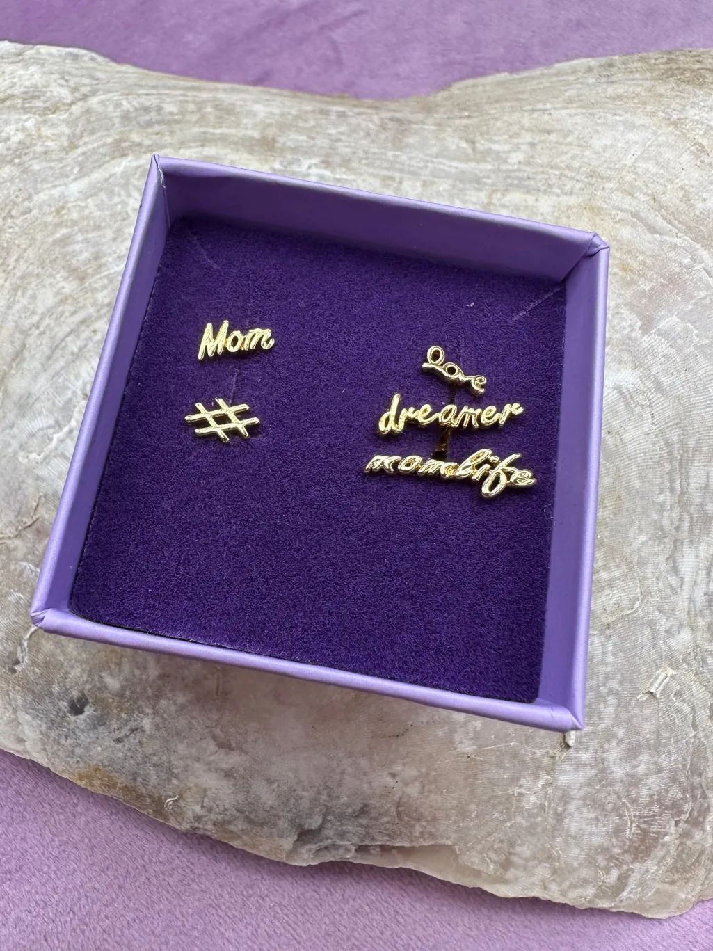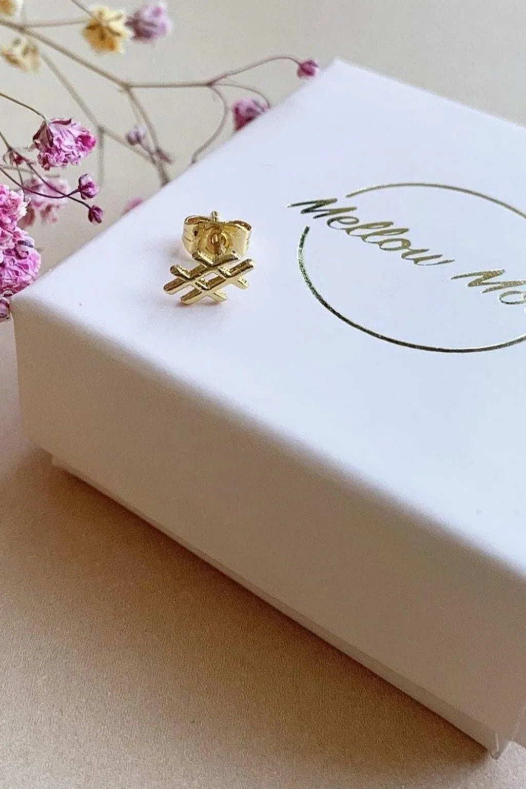 Forgyldt ørering fra Mellow Moon med hashtag-design. Øreringen har små bogstaver, der danner ordene ootd og love i en guldfarvet finish.