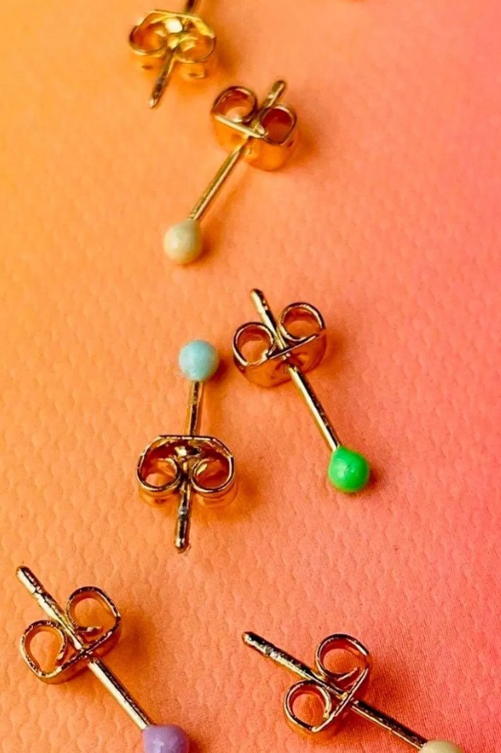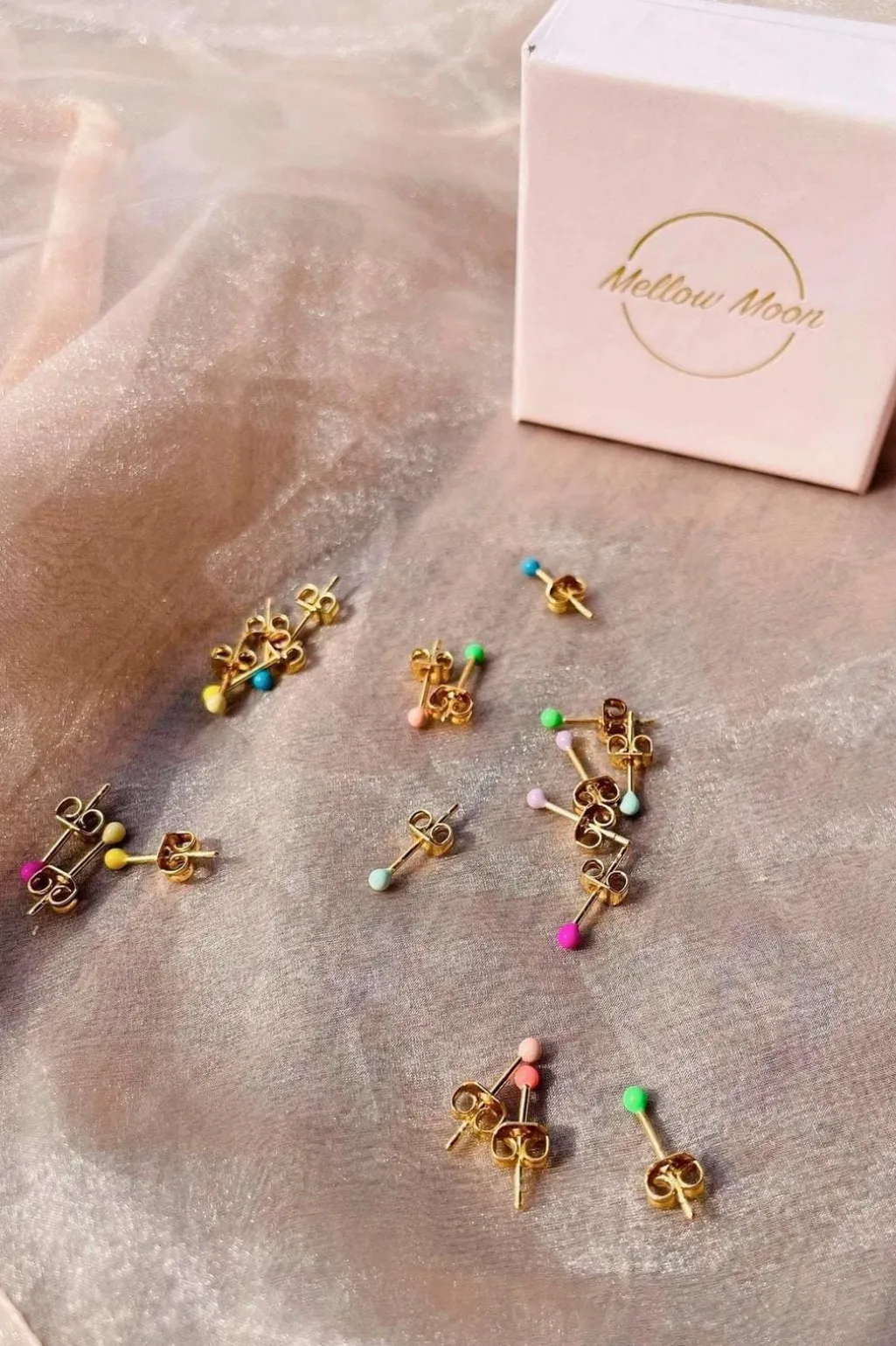 Forgyldte ørestikker fra Mellow Moon med farverige prikker. Ørestikkerne er fremstillet i 18 karat forgyldt messing og er uden nikkel og bly.