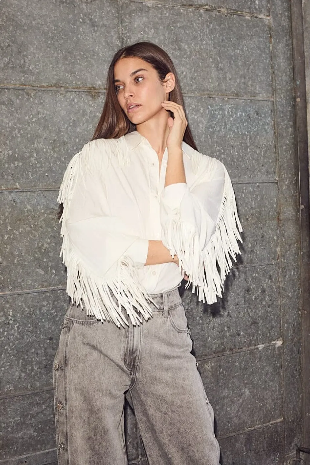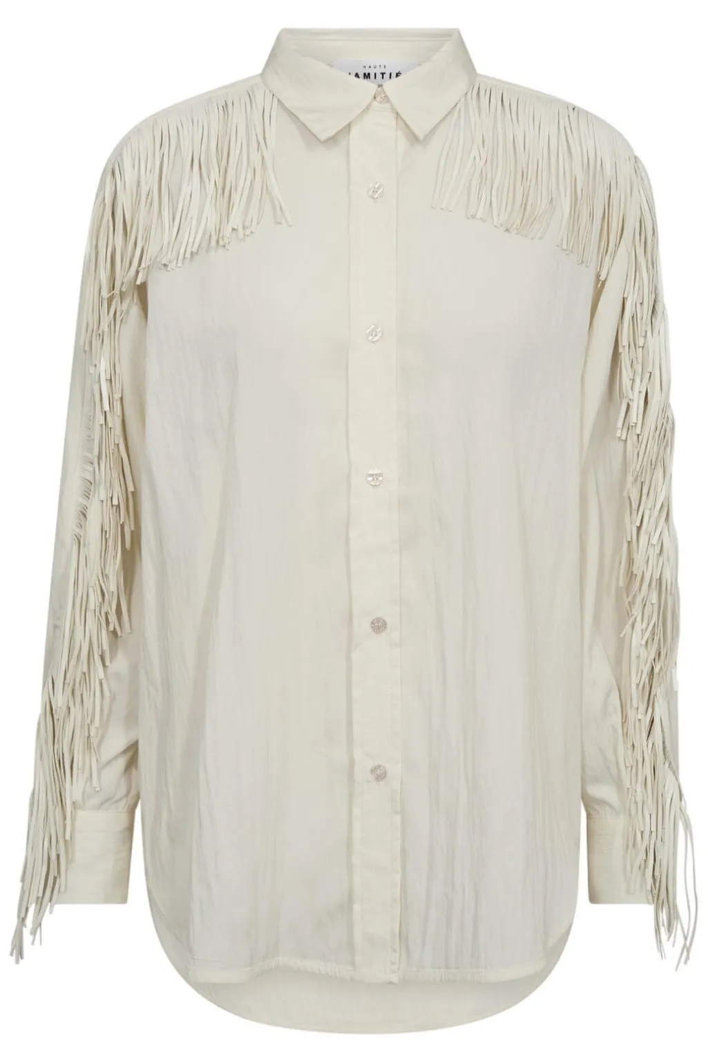 En off-white skjorte fra Haute L’Amitié med frynser langs skuldrene og ærmerne. Skjorten har en klassisk krave og knaplukning foran.