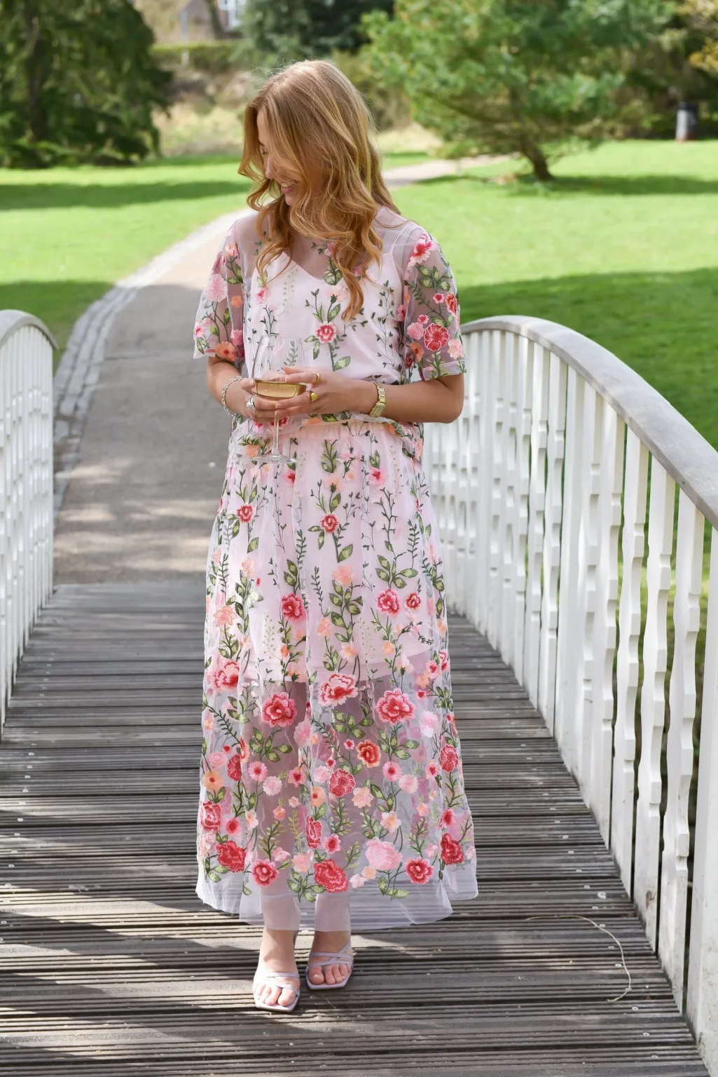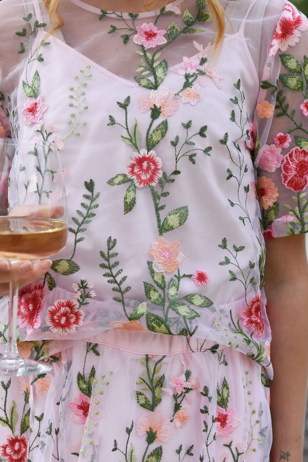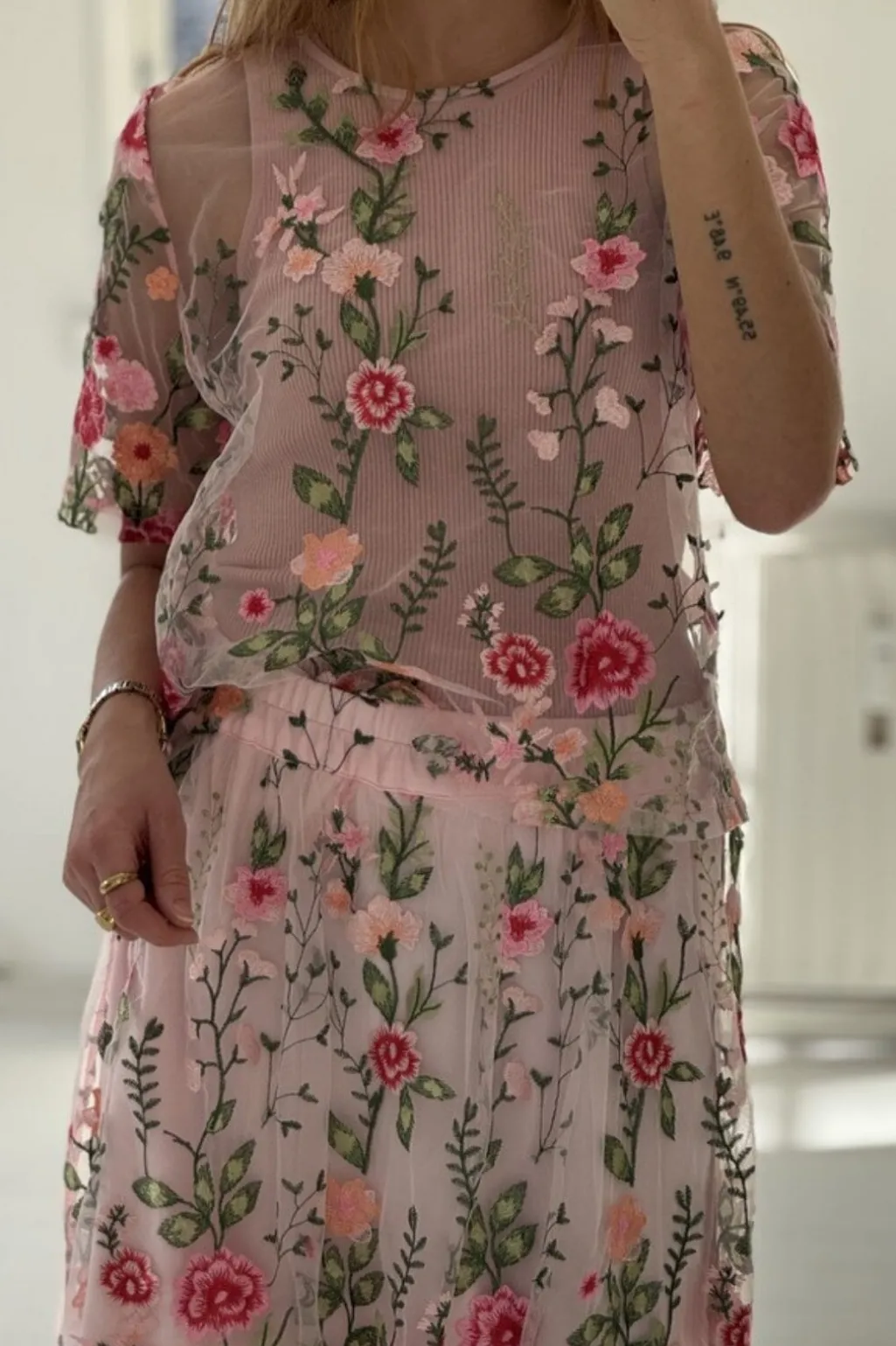 Lyserød bluse fra A-View med transparent stof og broderede blomster. Blusen har korte ærmer og en rund hals med knapper bagpå. Den leveres uden undertrøje.
