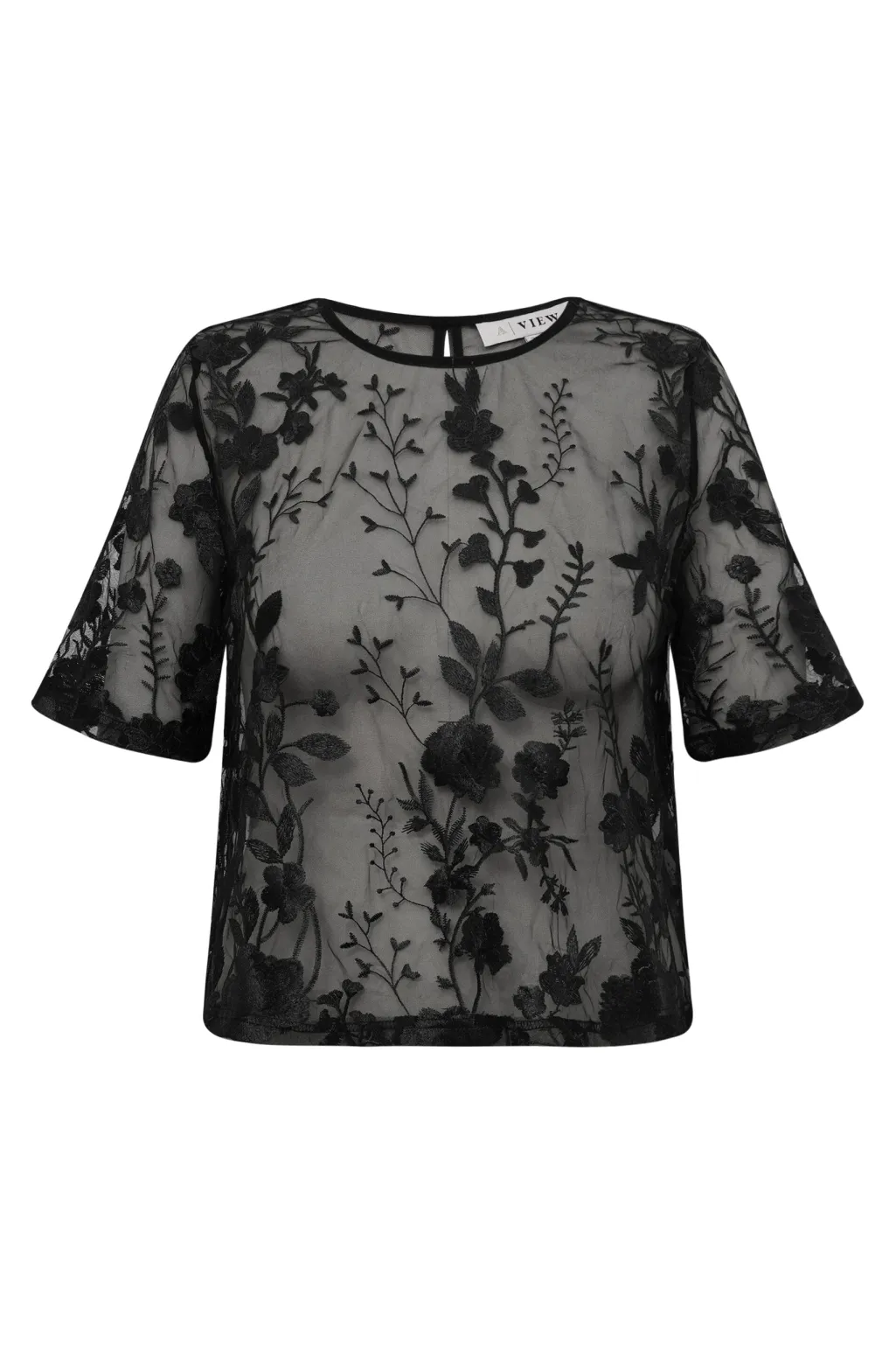 Sort bluse fra A-View, lavet af transparent mesh med broderede blomster. Blusen har korte, løse ærmer og en rund halsudskæring.