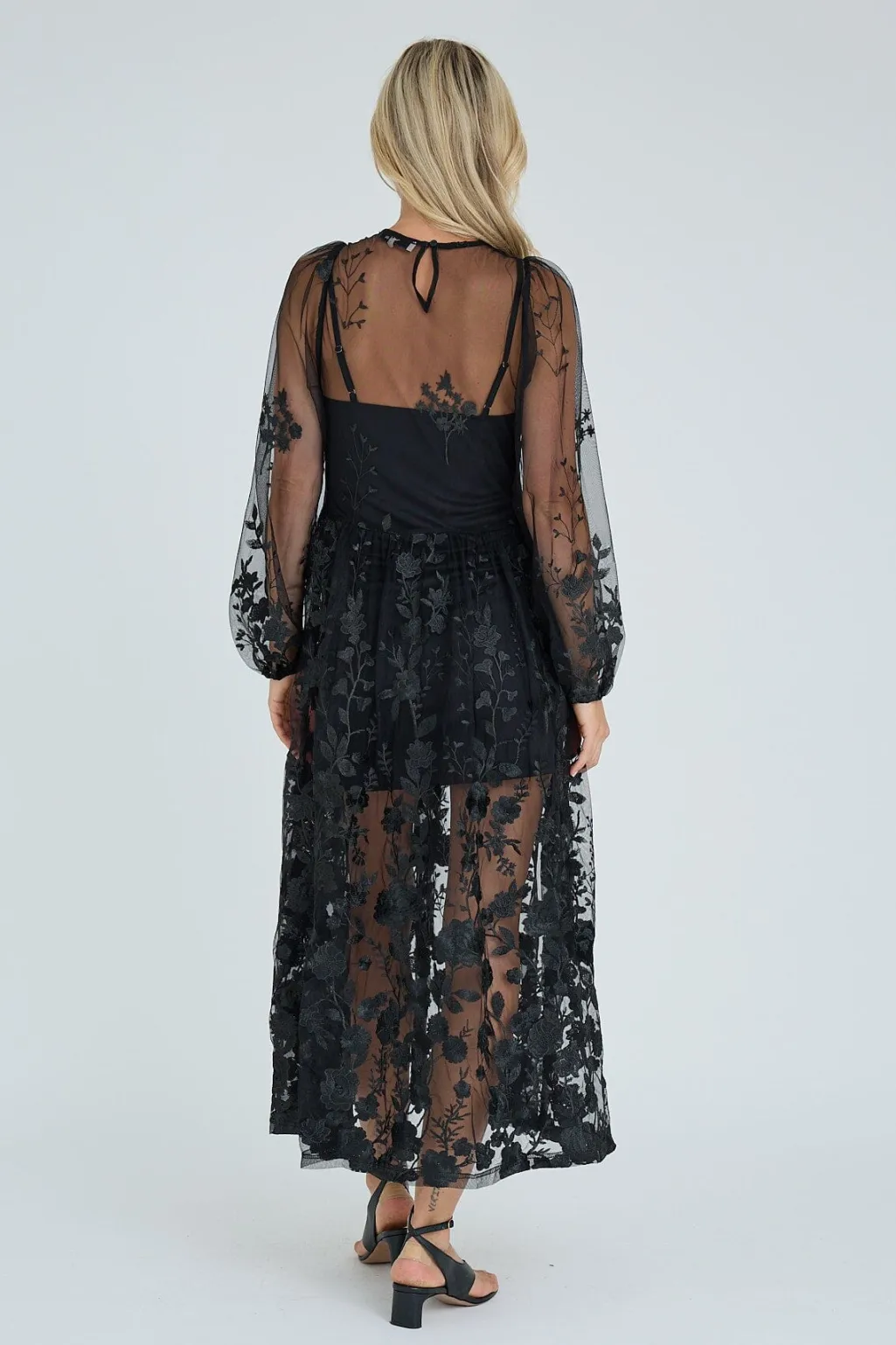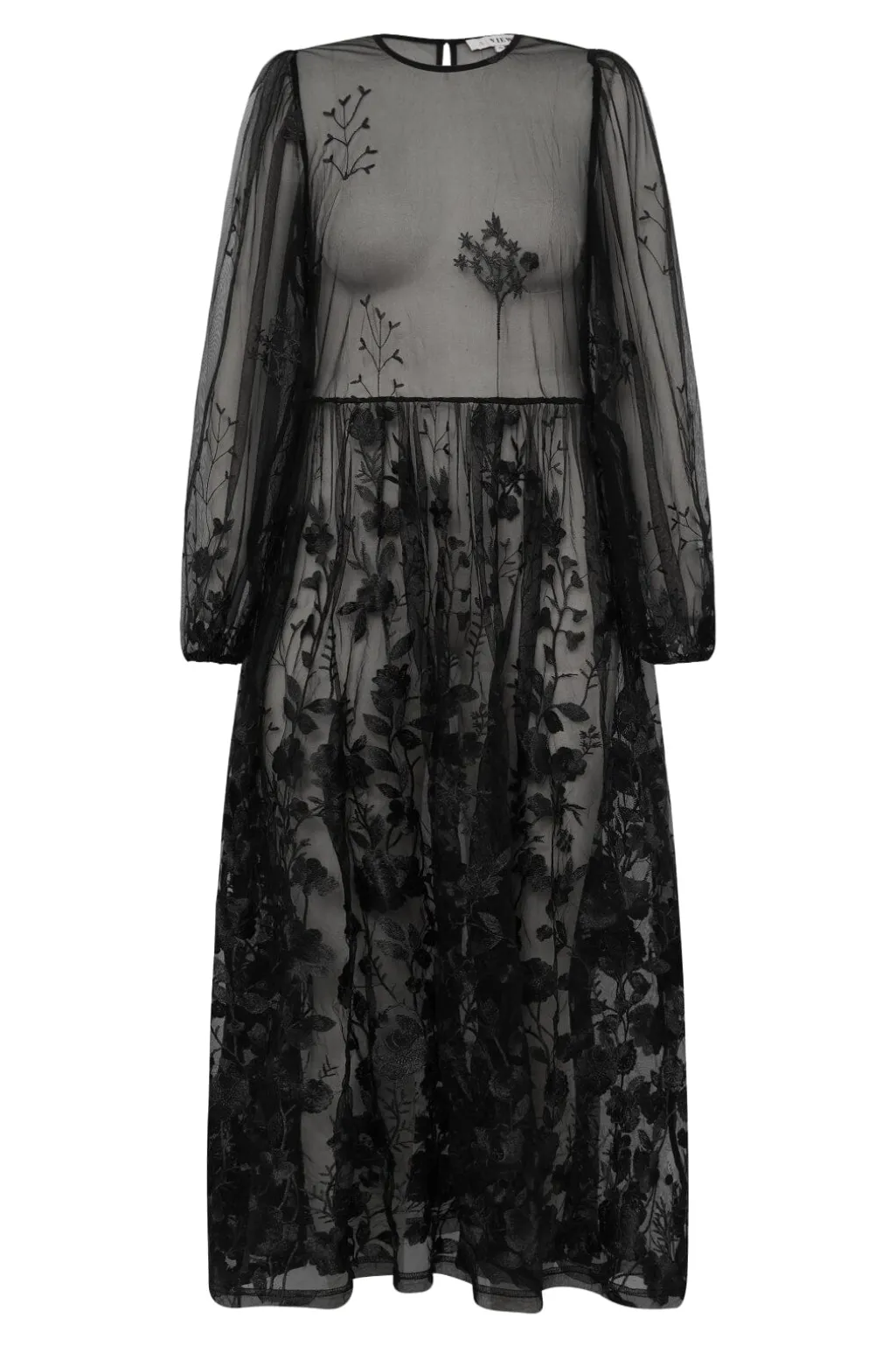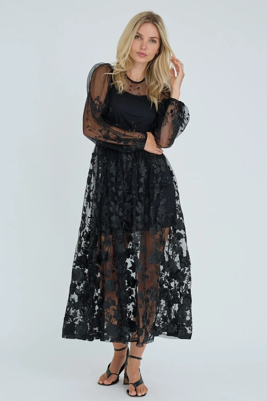 Sort kjole fra A-View, lavet af transparent mesh med broderede blomster. Kjolen er ankellang med en flydende nederdel.