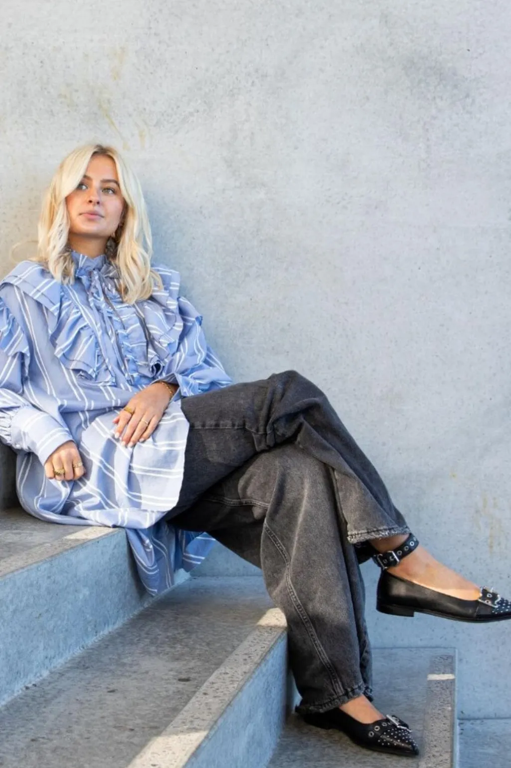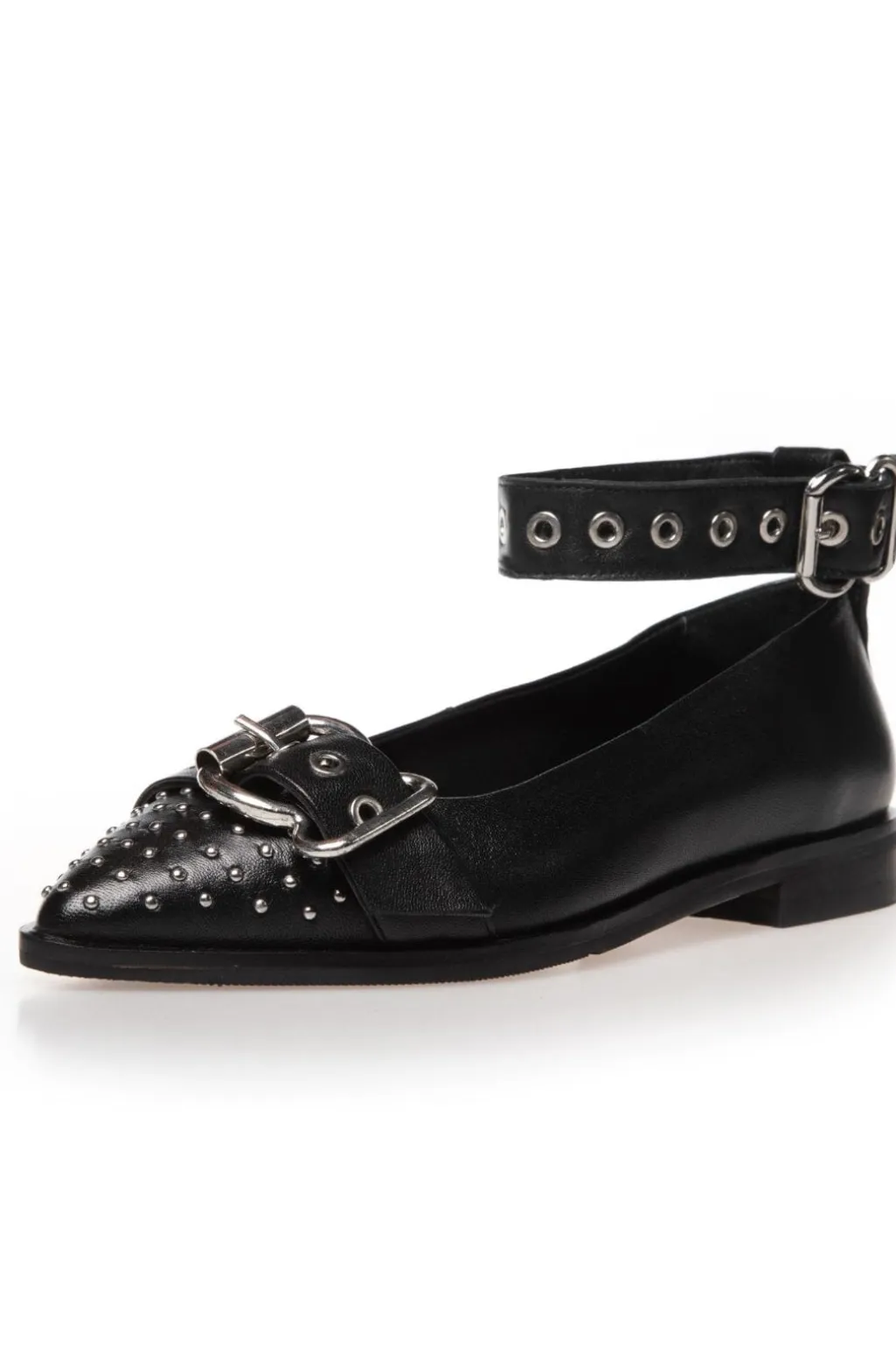 Sorte ballerinaer fra Copenhagen Shoes med spids tå og nitter. Skoene har en ankelrem med spænde og er lavet af læder. De kombinerer et klassisk design med rå detaljer.