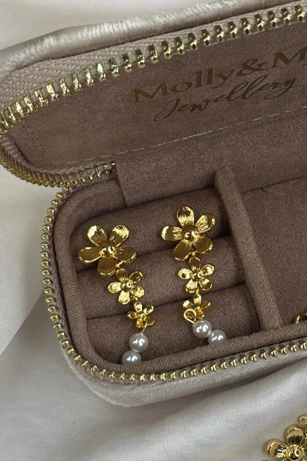 Smykker fra Molly&My Jewellery med blomsterformet design og perler. Smykkerne er lavet af rustfrit stål med en forgyldt overflade i gylden farve.