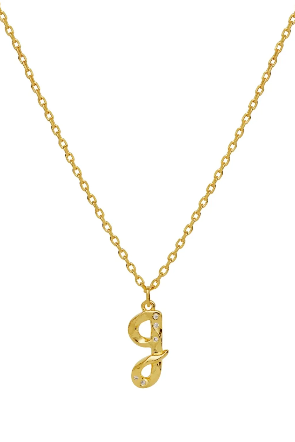 Guldbelagt halskæde fra Maanesten med et G-formet vedhæng. Halskæden er lavet af genanvendt sterlingsølv med en 18 karat guldbelægning og har små dekorative detaljer på vedhænget.
