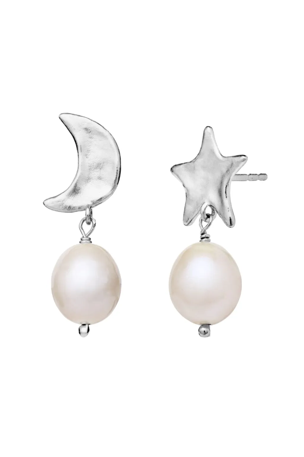 Sølvøreringe fra Maanesten med måne- og stjerneformede vedhæng. De asymmetriske øreringe har hvide perler og en skinnende overflade i genanvendt sterling sølv.